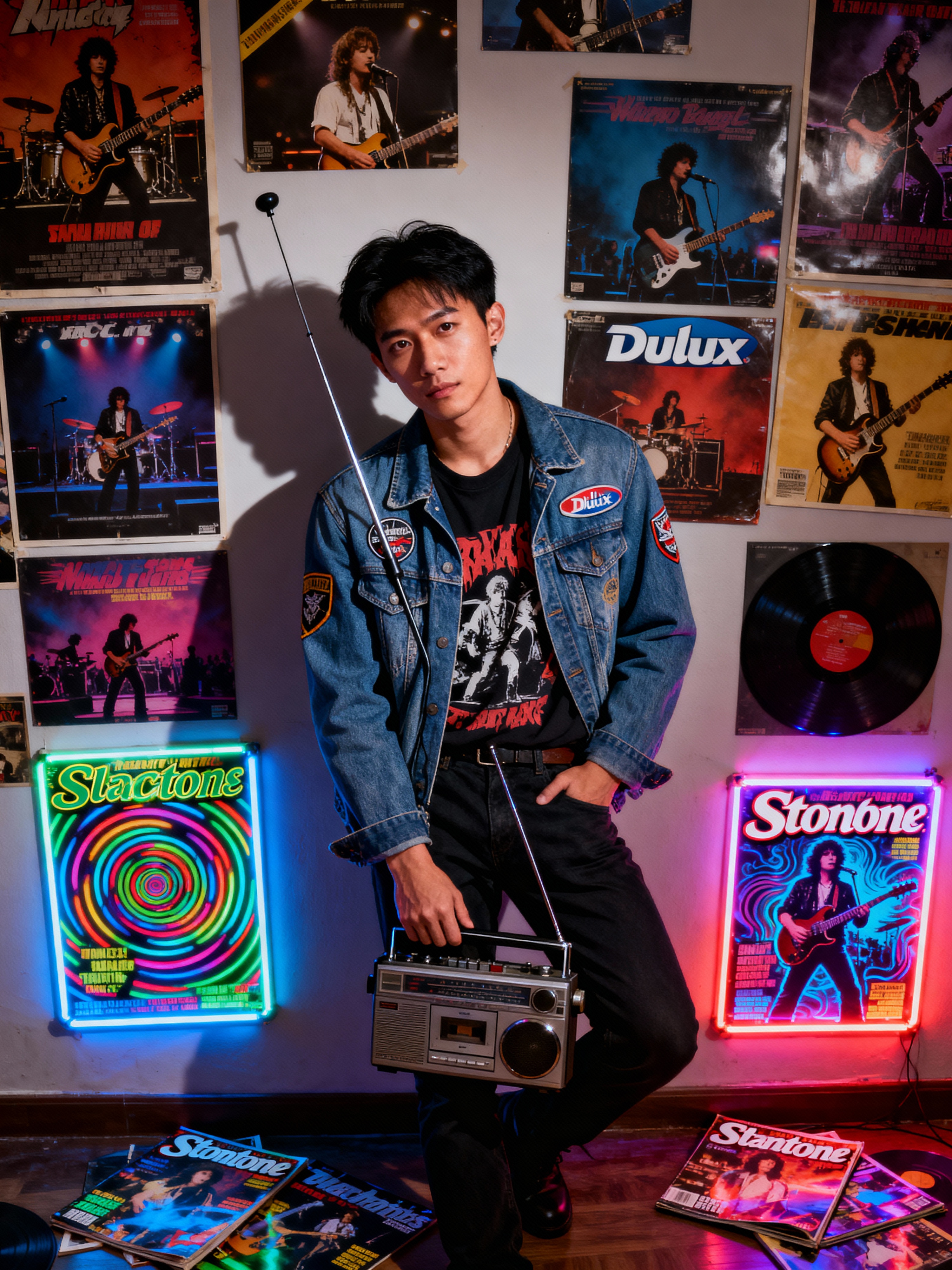 model leaning against a wall covered in concert posters and album covers, wearing a denim jacket with patches over a band t-shirt, holding a transistor radio with telescoping antenna, scattered Rolling Stone magazines on the floor, psychedelic blacklight posters glowing under colored lighting
