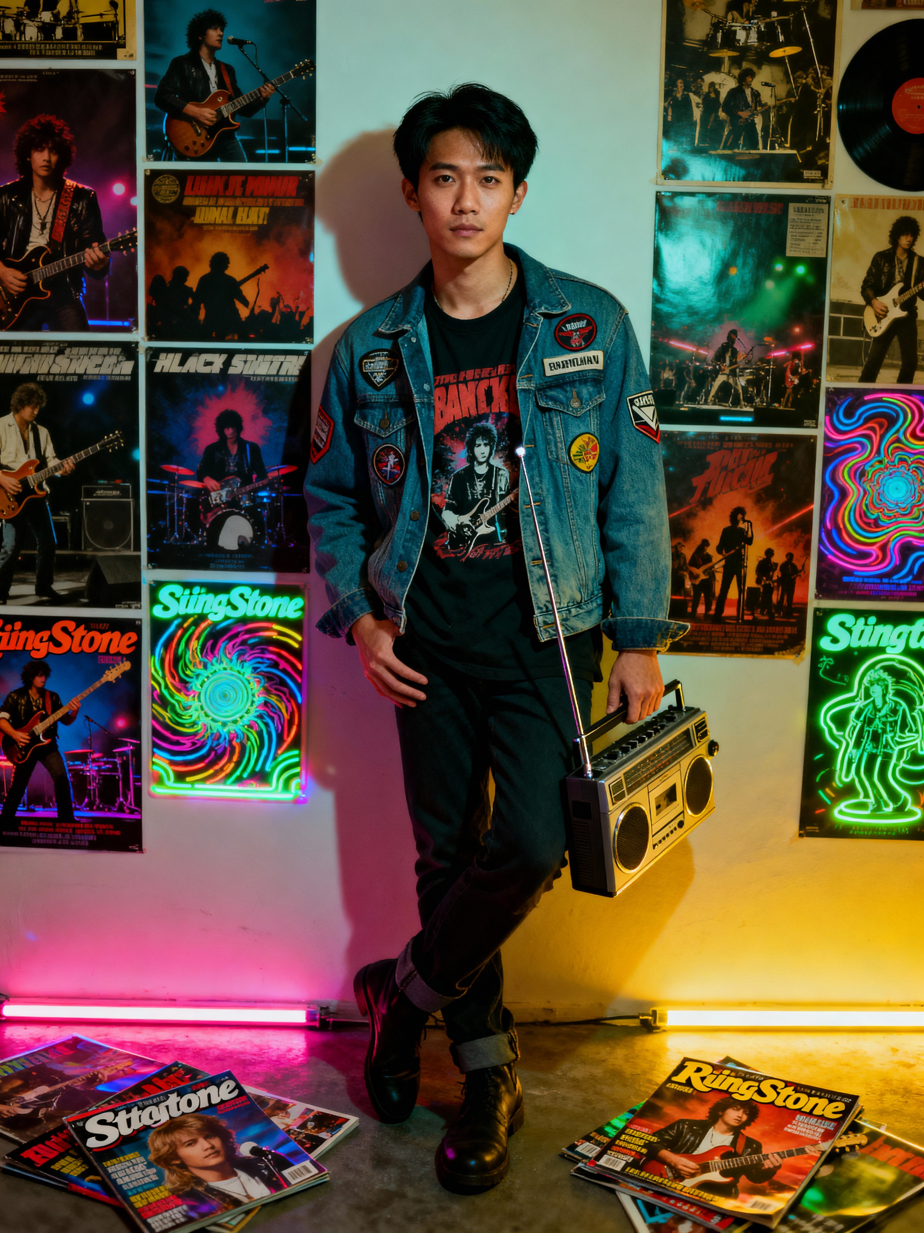 model leaning against a wall covered in concert posters and album covers, wearing a denim jacket with patches over a band t-shirt, holding a transistor radio with telescoping antenna, scattered Rolling Stone magazines on the floor, psychedelic blacklight posters glowing under colored lighting