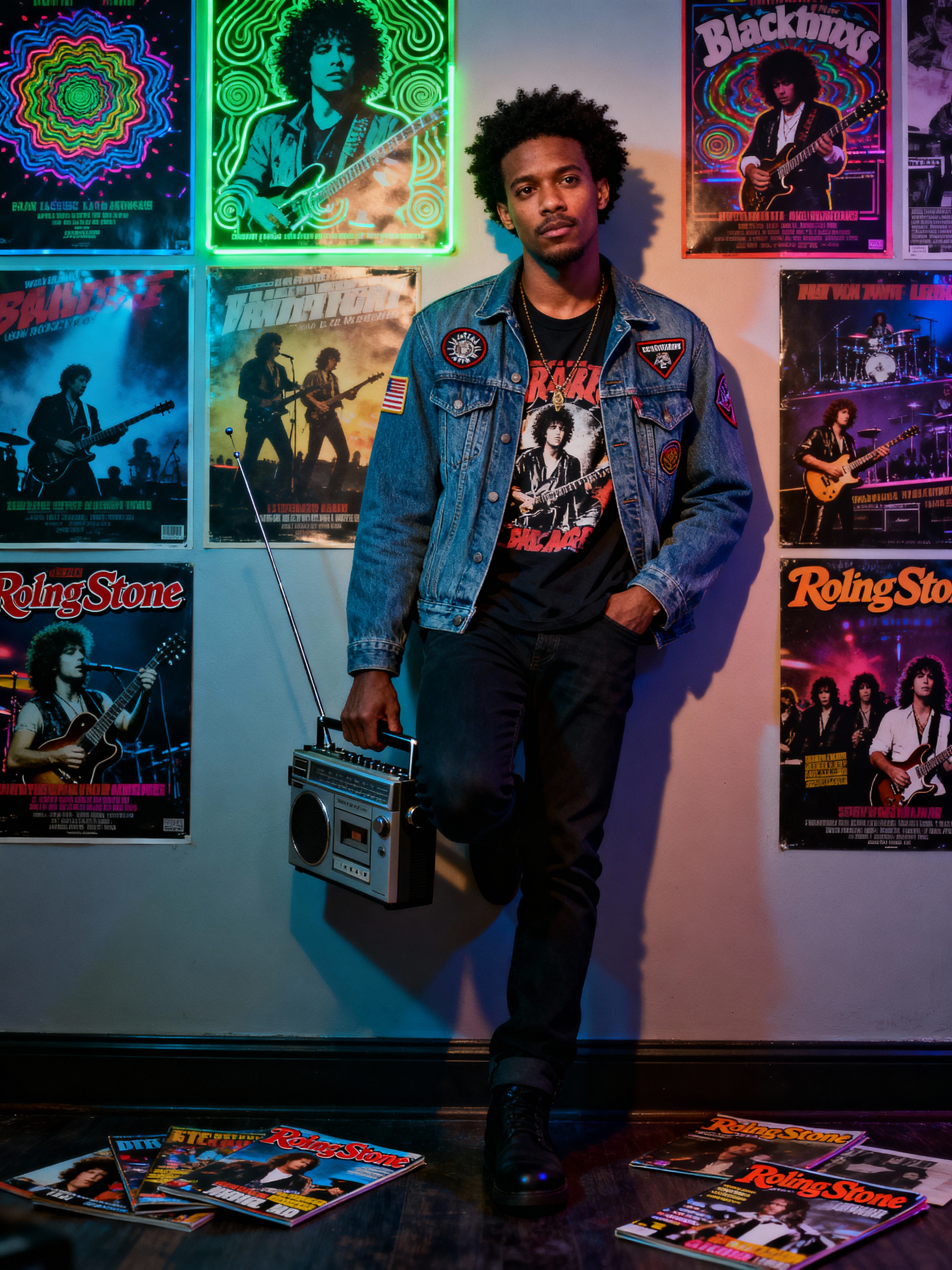 model leaning against a wall covered in concert posters and album covers, wearing a denim jacket with patches over a band t-shirt, holding a transistor radio with telescoping antenna, scattered Rolling Stone magazines on the floor, psychedelic blacklight posters glowing under colored lighting