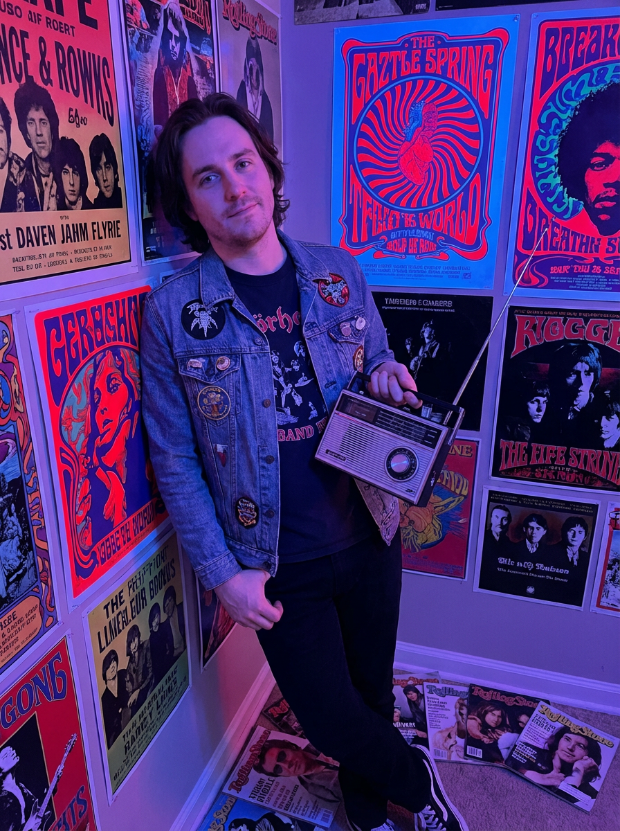 model leaning against a wall covered in concert posters and album covers, wearing a denim jacket with patches over a band t-shirt, holding a transistor radio with telescoping antenna, scattered Rolling Stone magazines on the floor, psychedelic blacklight posters glowing under colored lighting