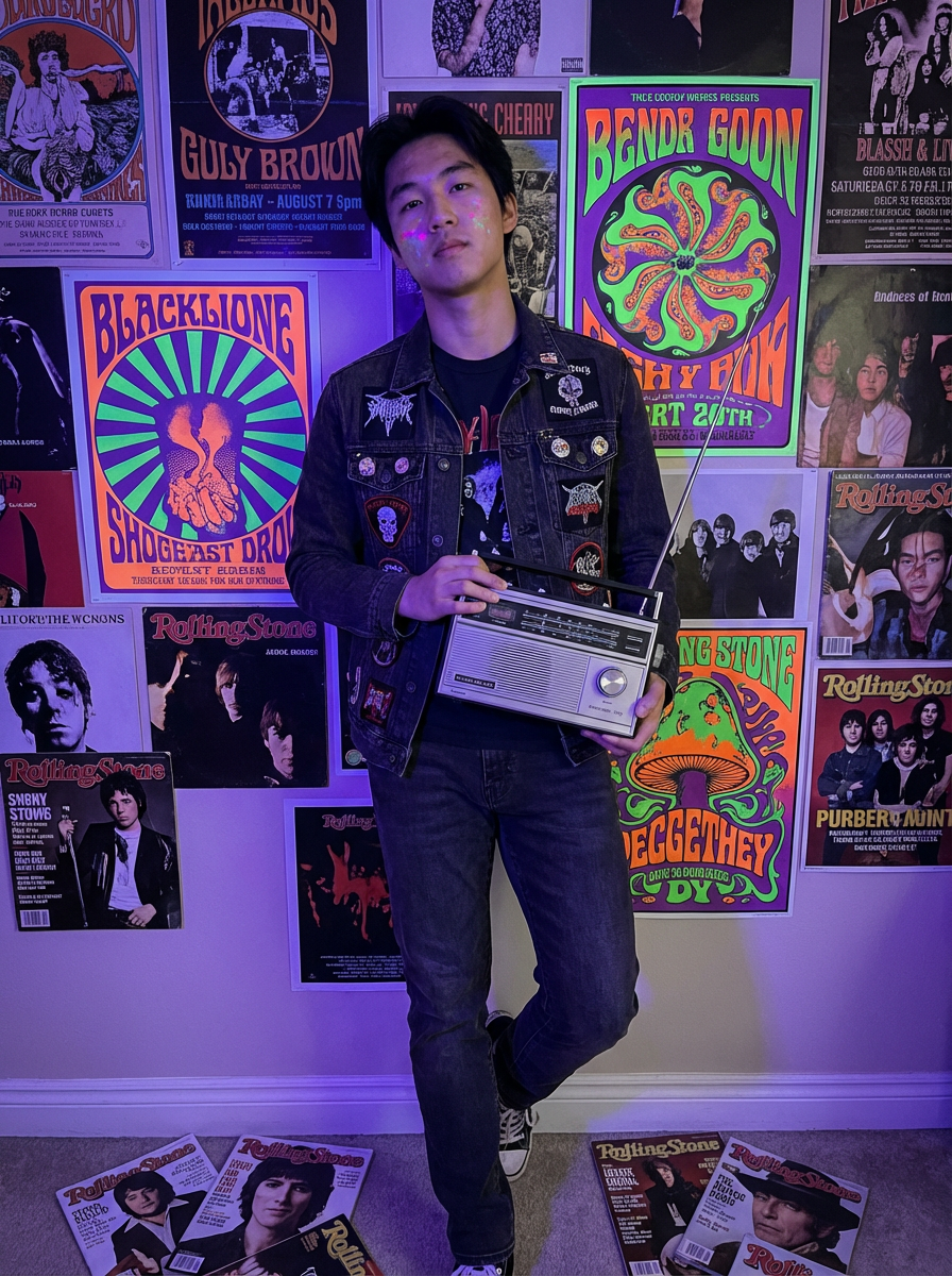 model leaning against a wall covered in concert posters and album covers, wearing a denim jacket with patches over a band t-shirt, holding a transistor radio with telescoping antenna, scattered Rolling Stone magazines on the floor, psychedelic blacklight posters glowing under colored lighting