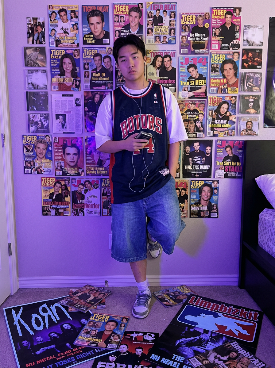 model leaning against a wall covered in teen magazine cutouts and CD inserts, wearing an oversized jersey with baggy shorts, holding a Walkman with tangled earbuds, scattered Tiger Beat and J-14 magazines on the floor, blacklight posters of Nu Metal bands