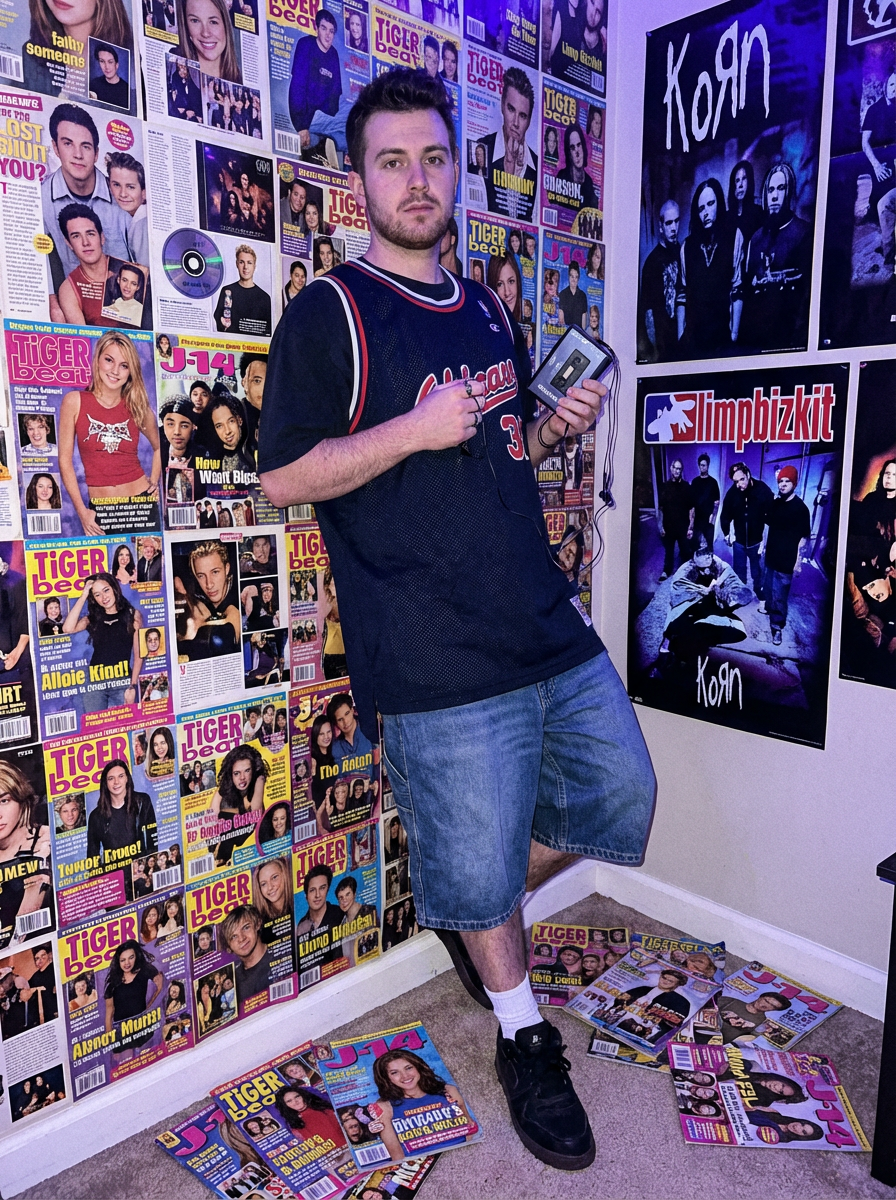 model leaning against a wall covered in teen magazine cutouts and CD inserts, wearing an oversized jersey with baggy shorts, holding a Walkman with tangled earbuds, scattered Tiger Beat and J-14 magazines on the floor, blacklight posters of Nu Metal bands