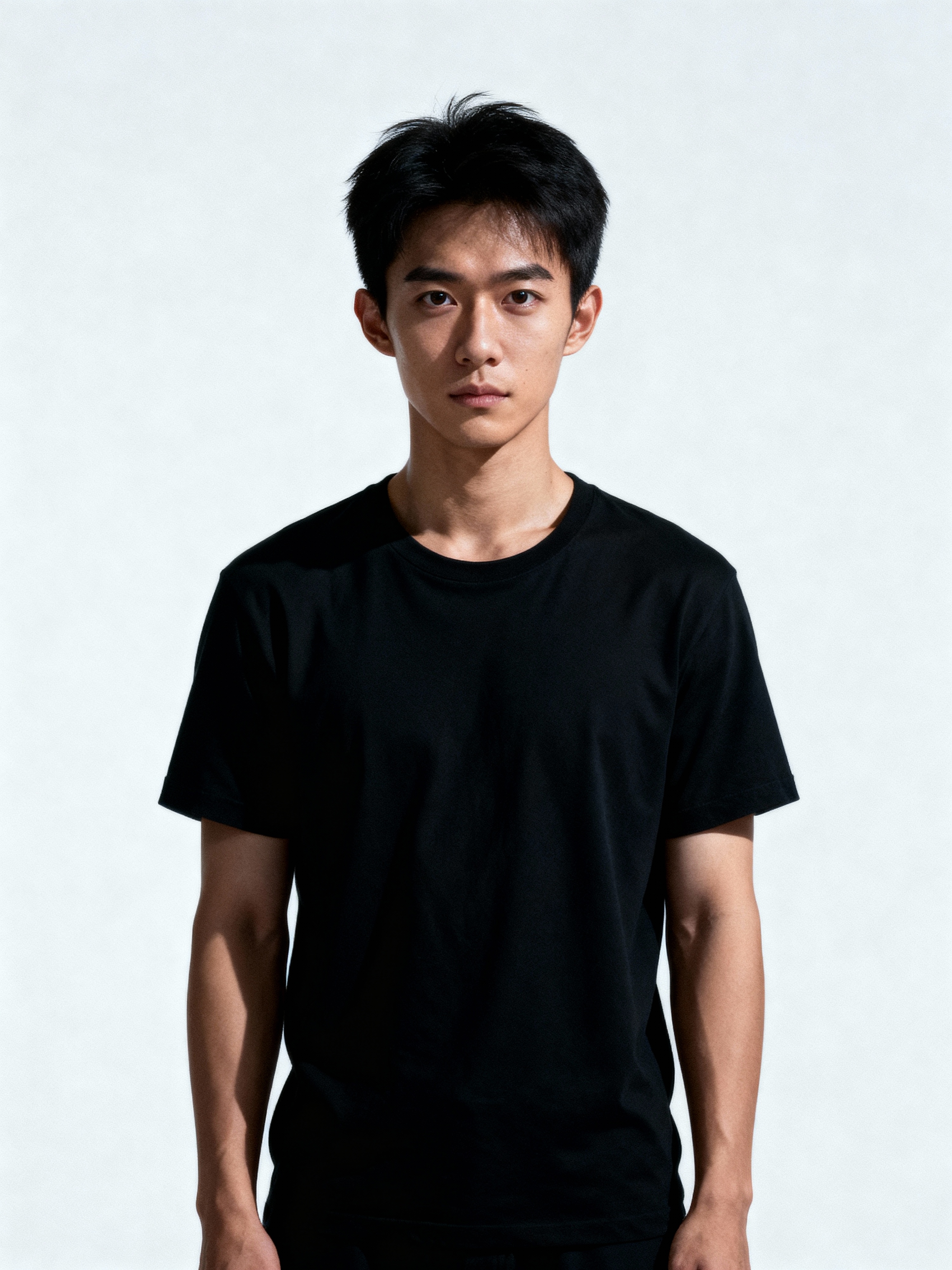 model looking straight into camera with mouth closed and no emotion. plain background. wearing black t-shirt