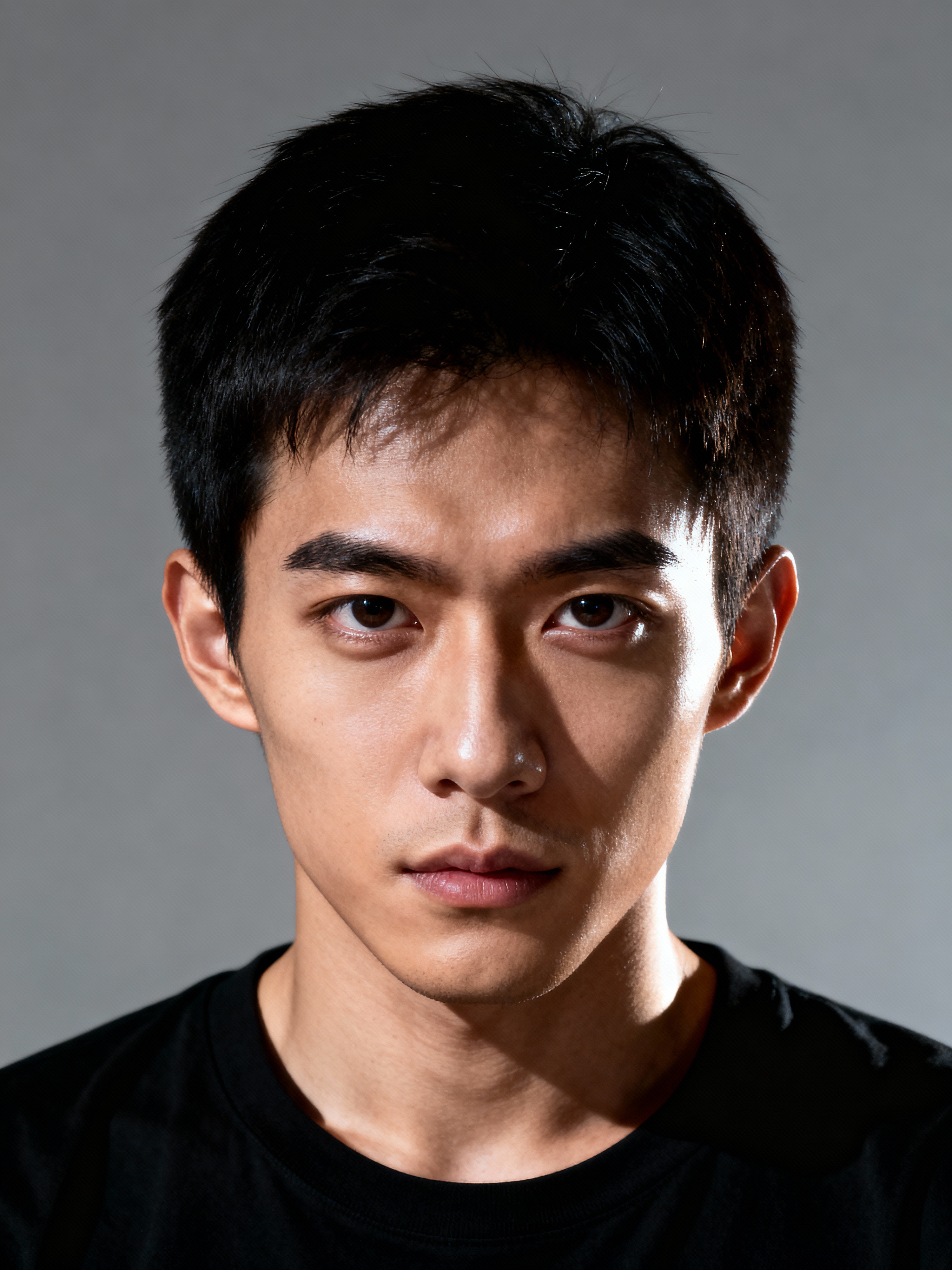 model looking straight into camera with mouth closed and no emotion. plain background. wearing black t-shirt