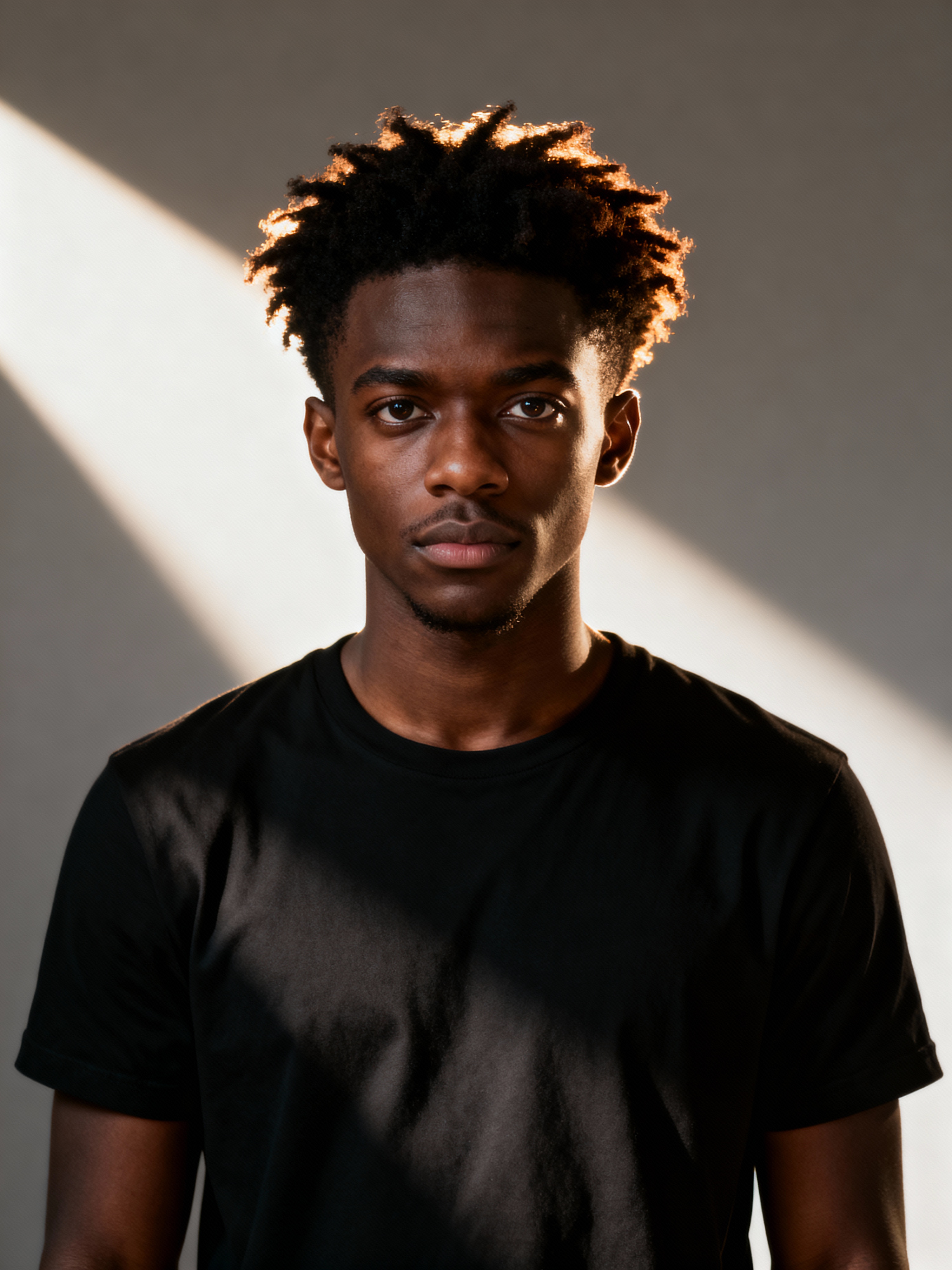 model looking straight into camera with mouth closed and no emotion. plain background. wearing black t-shirt