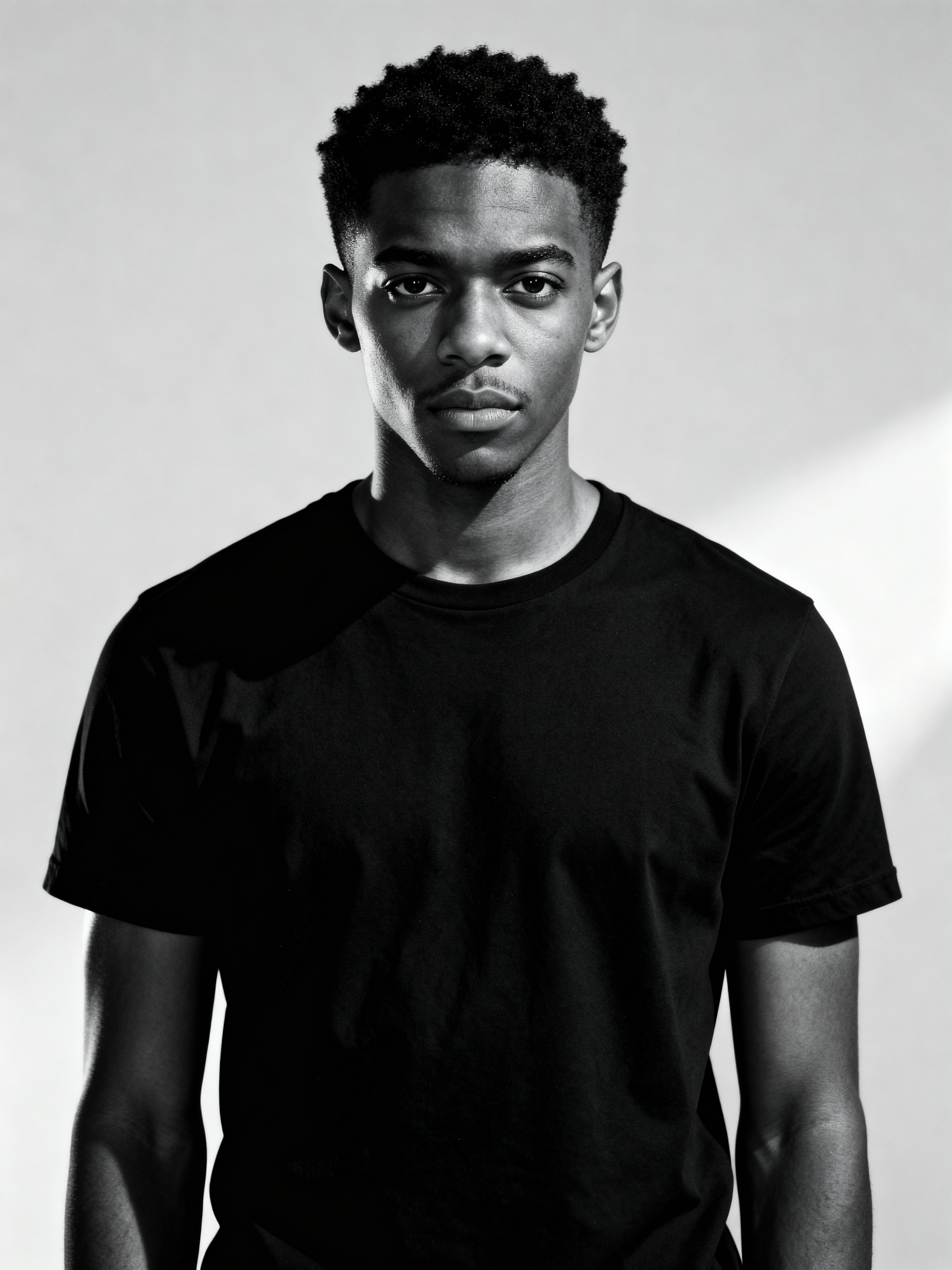 model looking straight into camera with mouth closed and no emotion. plain background. wearing black t-shirt