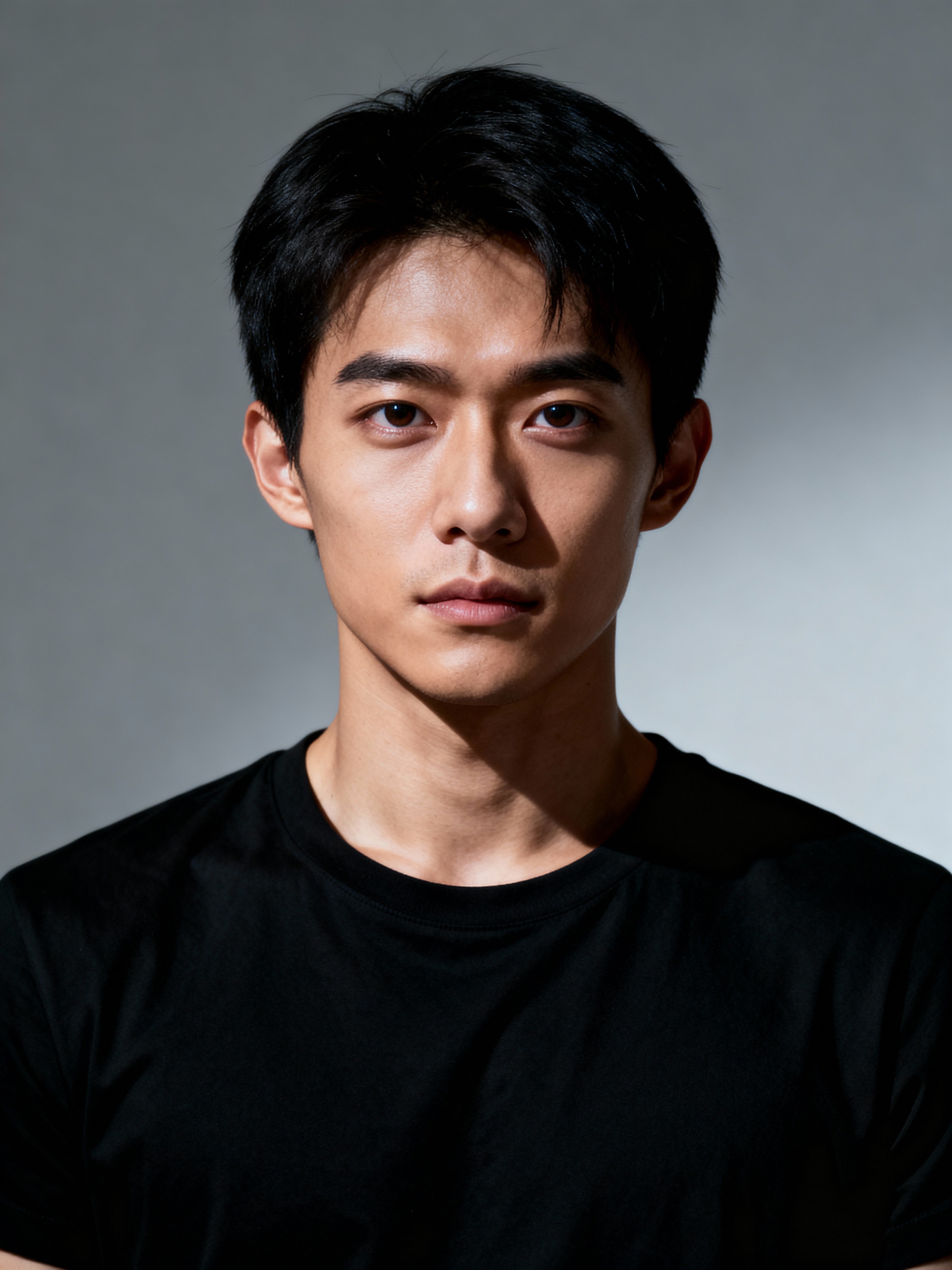 model looking straight into camera with mouth closed and no emotion. plain background. wearing black t-shirt