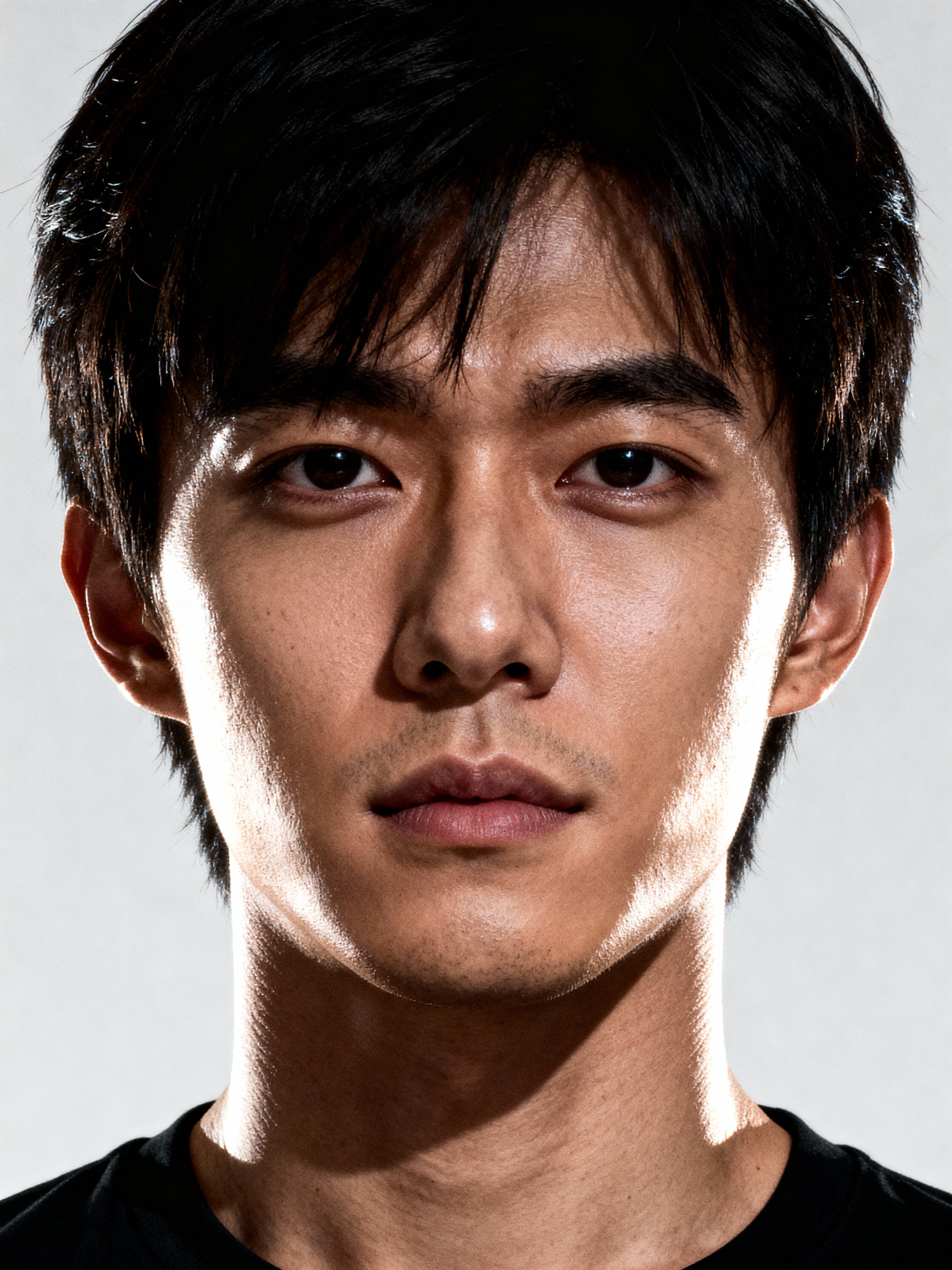 model looking straight into camera with mouth closed and no emotion. plain background. wearing black t-shirt