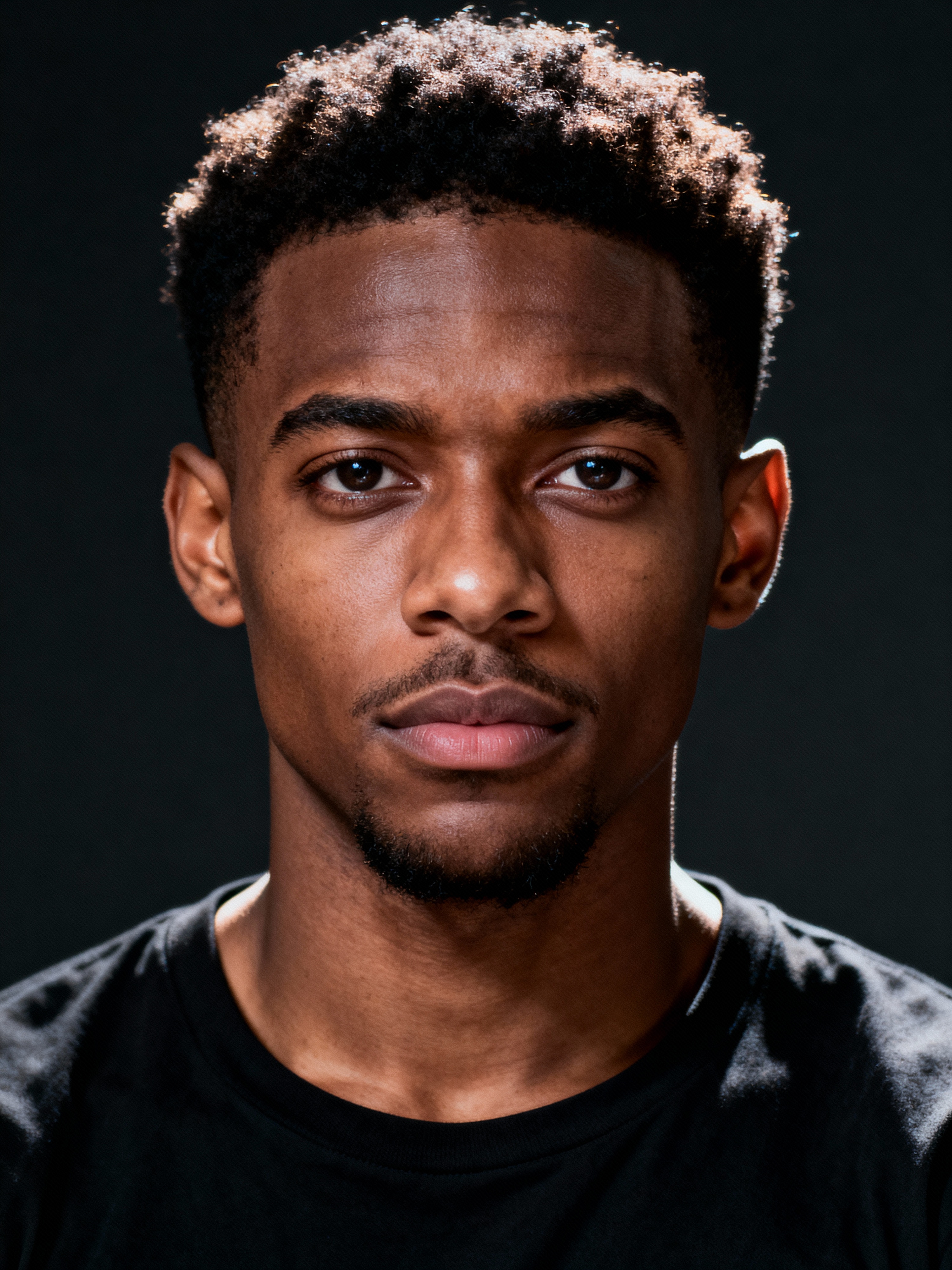 model looking straight into camera with mouth closed and no emotion. plain background. wearing black t-shirt