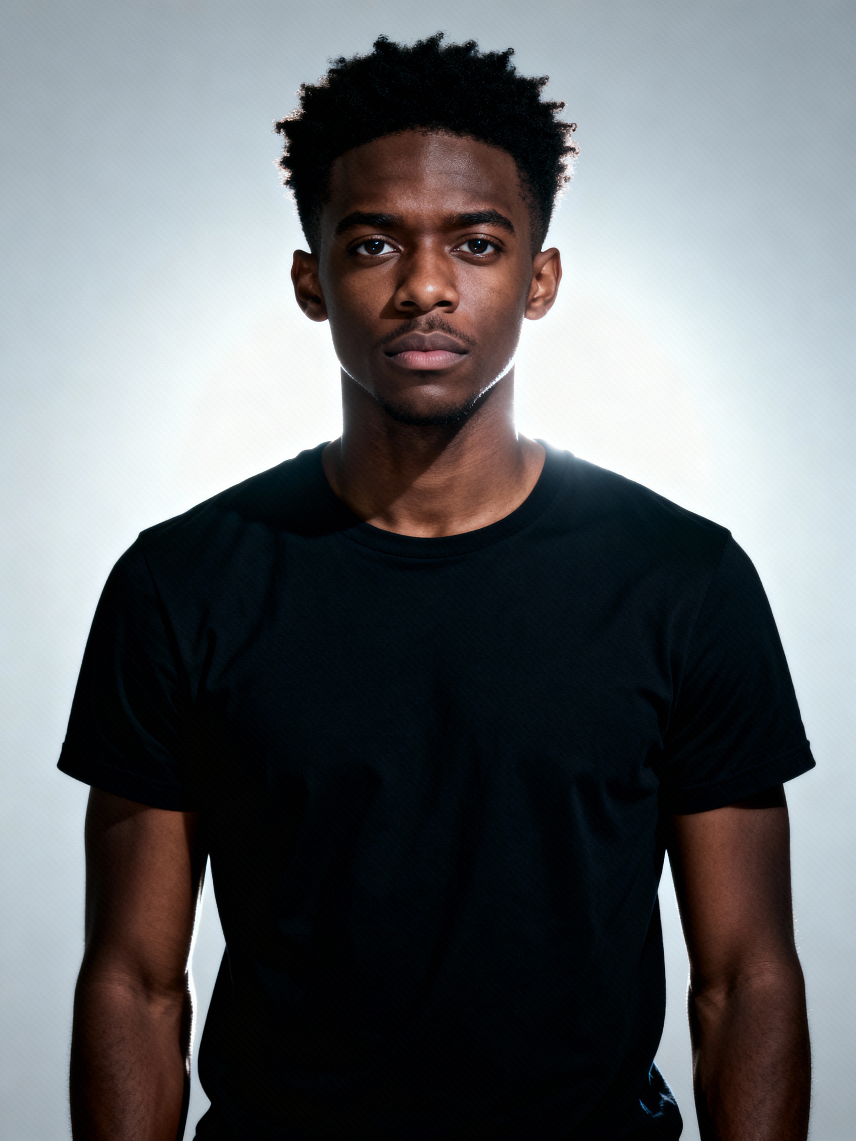 model looking straight into camera with mouth closed and no emotion. plain background. wearing black t-shirt