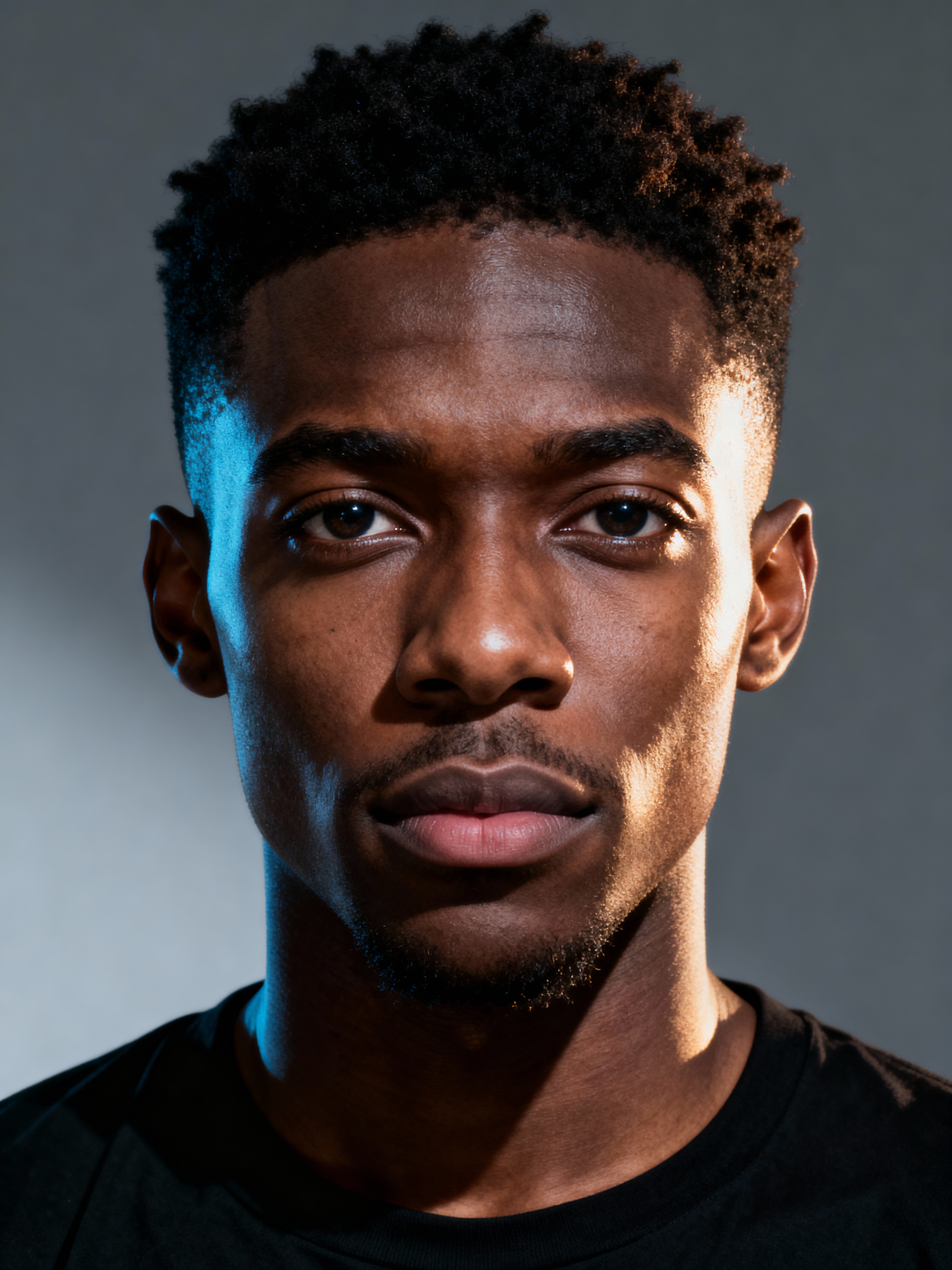 model looking straight into camera with mouth closed and no emotion. plain background. wearing black t-shirt