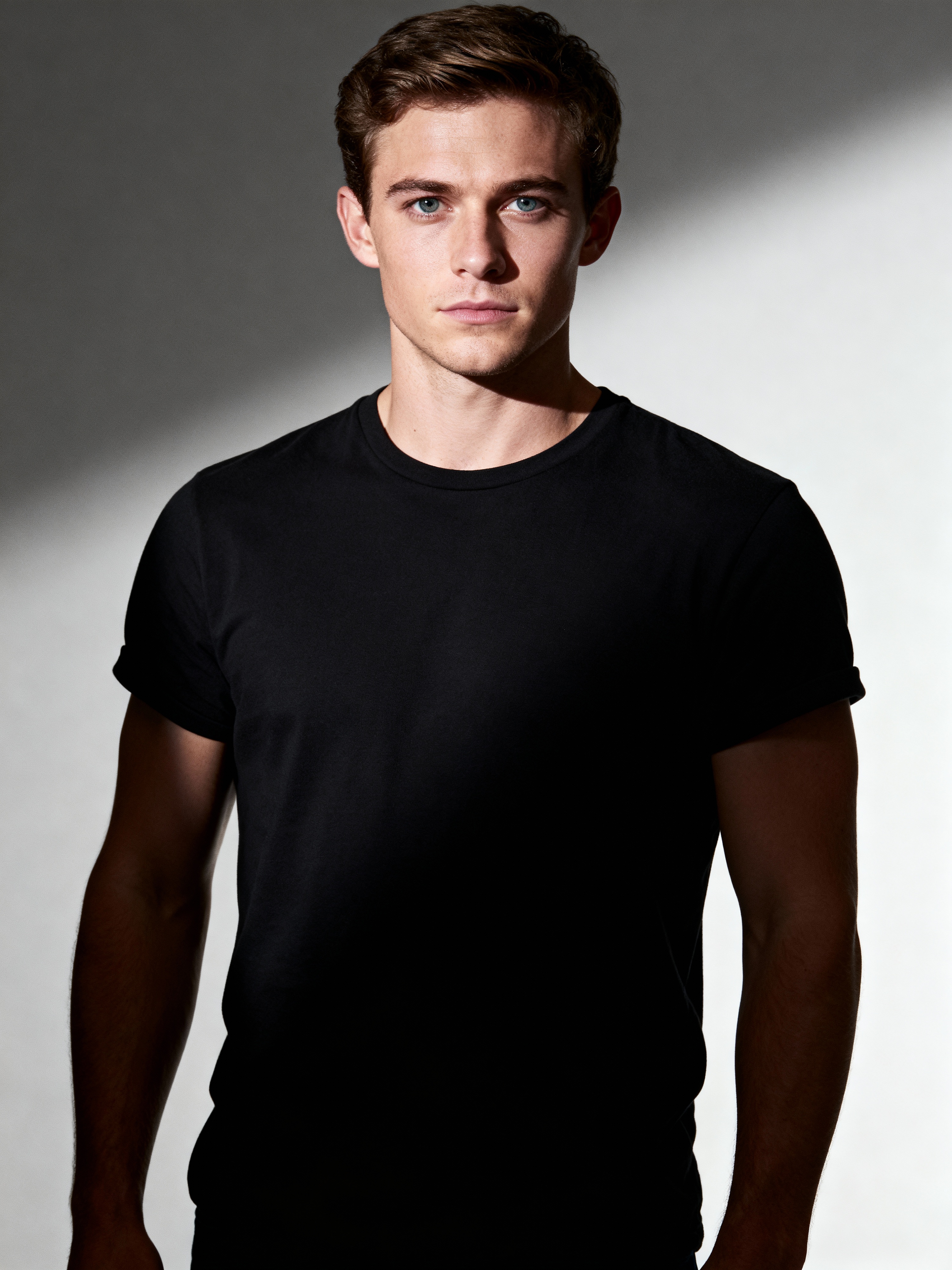 model looking straight into camera with mouth closed and no emotion. plain background. wearing black t-shirt