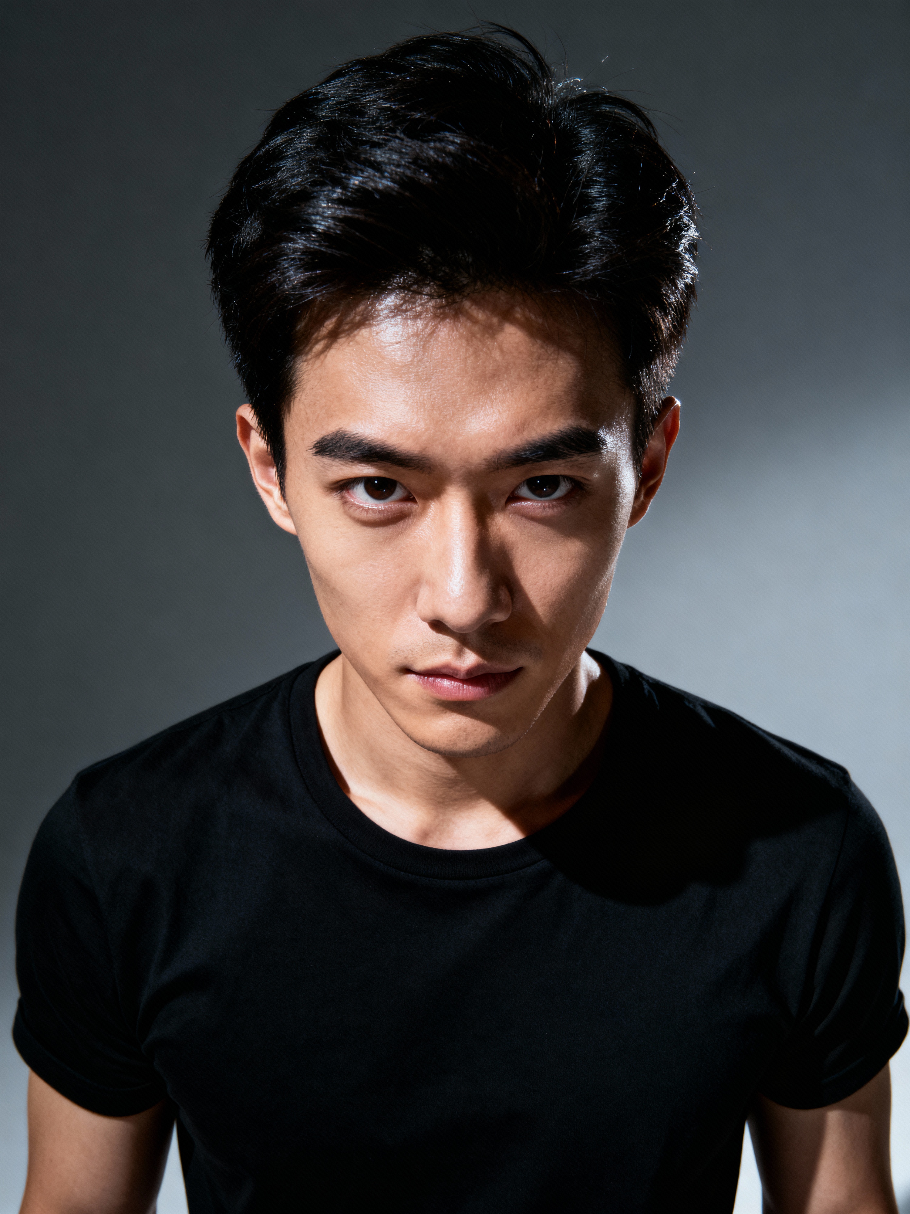 model looking straight into camera with mouth closed and no emotion. plain background. wearing black t-shirt