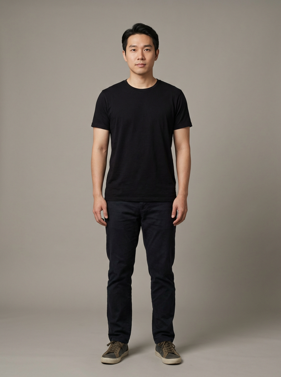model looking straight into camera with mouth closed and no emotion. plain background. wearing black t-shirt