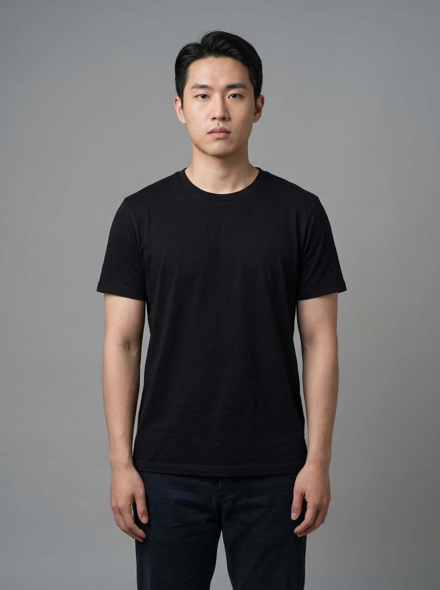 model looking straight into camera with mouth closed and no emotion. plain background. wearing black t-shirt