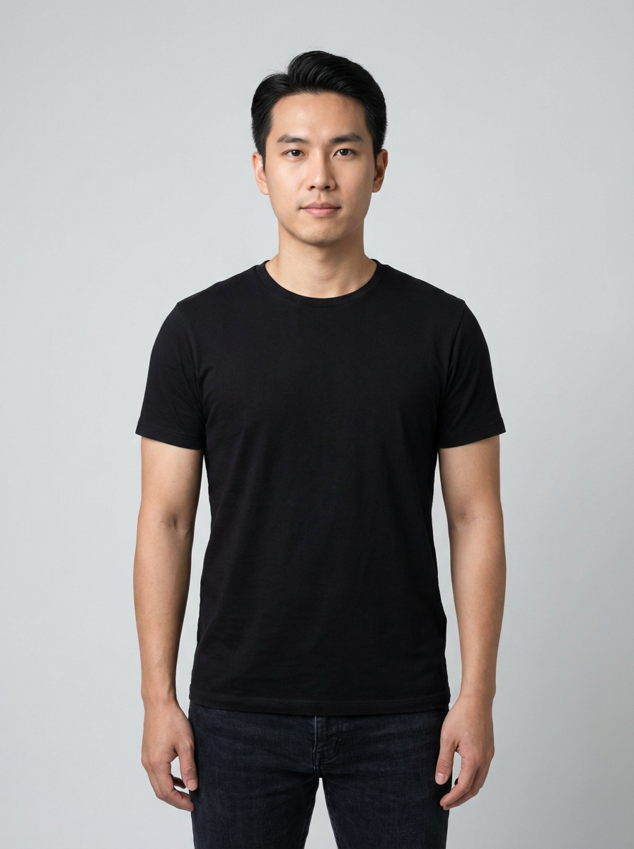 model looking straight into camera with mouth closed and no emotion. plain background. wearing black t-shirt