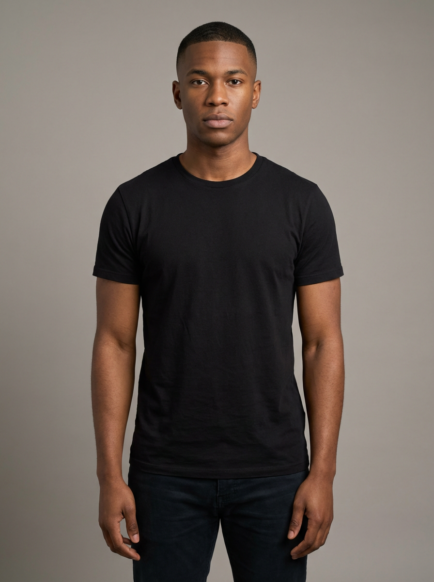 model looking straight into camera with mouth closed and no emotion. plain background. wearing black t-shirt