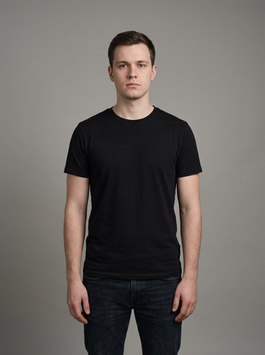 model looking straight into camera with mouth closed and no emotion. plain background. wearing black t-shirt