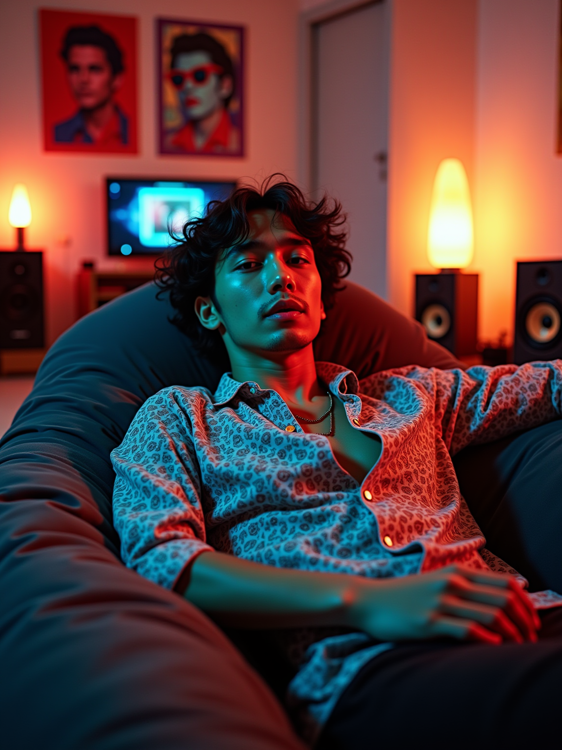 model lounging on a bean bag chair with vinyl pillows, wearing a paisley shirt unbuttoned with love beads, surrounded by floor speakers and a component stereo system, op art and Andy Warhol prints on walls, lava lamp and fiber optic lamp creating ambient mood lighting