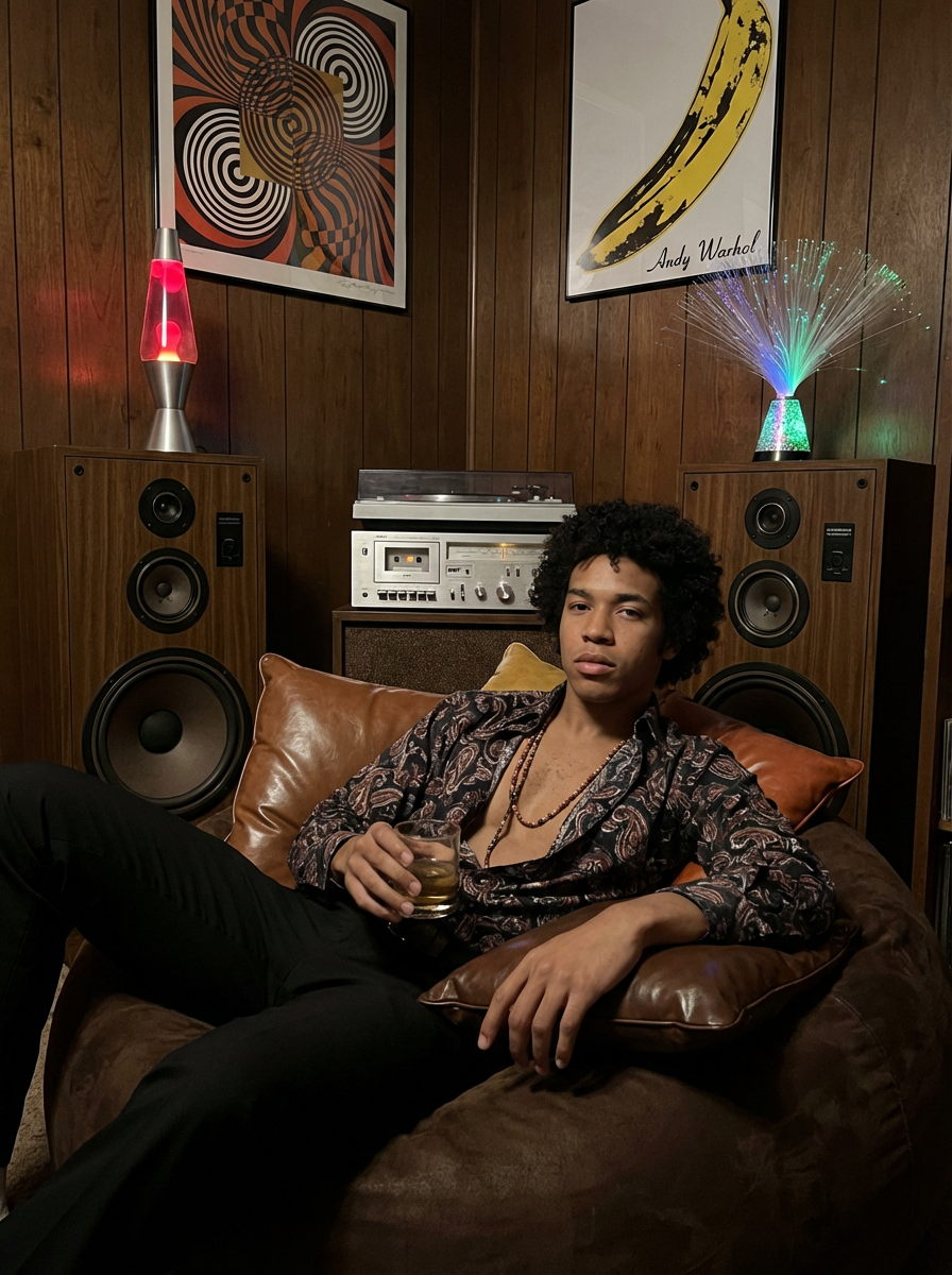 model lounging on a bean bag chair with vinyl pillows, wearing a paisley shirt unbuttoned with love beads, surrounded by floor speakers and a component stereo system, op art and Andy Warhol prints on walls, lava lamp and fiber optic lamp creating ambient mood lighting