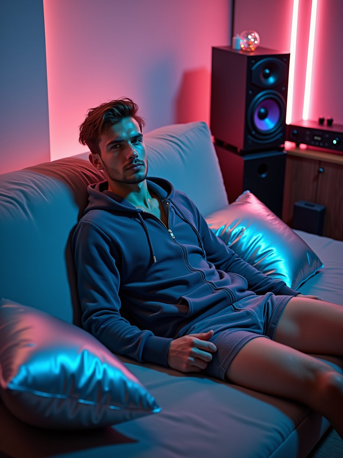 model lounging on a futon with metallic pillows, wearing a zip-up hoodie with athletic shorts, surrounded by tower speakers and a component stereo system, frosted glass and chrome decor on walls, plasma ball and fiber optic decorations creating ambient lighting