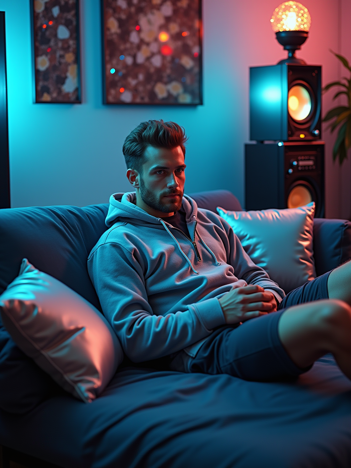 model lounging on a futon with metallic pillows, wearing a zip-up hoodie with athletic shorts, surrounded by tower speakers and a component stereo system, frosted glass and chrome decor on walls, plasma ball and fiber optic decorations creating ambient lighting