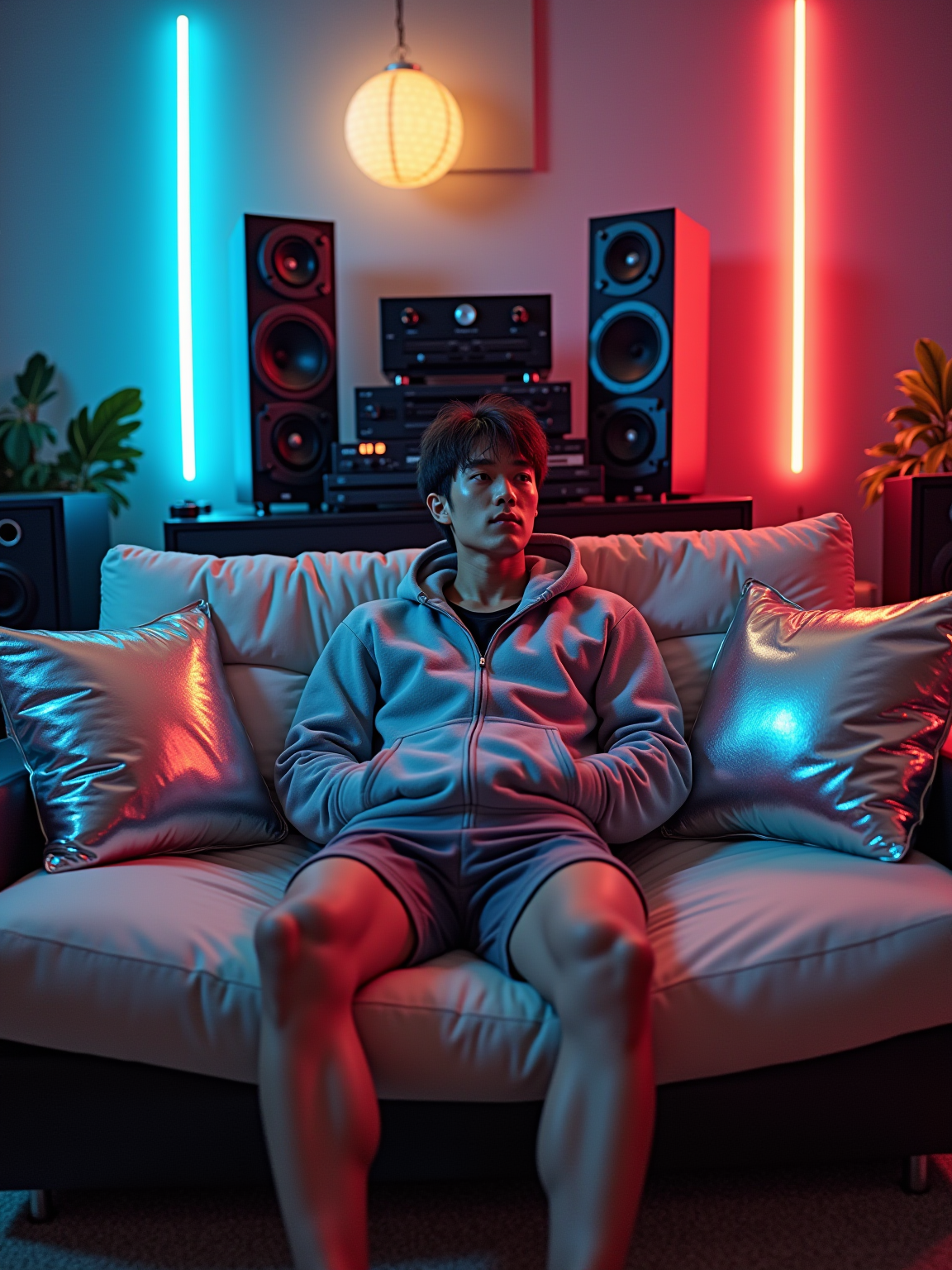model lounging on a futon with metallic pillows, wearing a zip-up hoodie with athletic shorts, surrounded by tower speakers and a component stereo system, frosted glass and chrome decor on walls, plasma ball and fiber optic decorations creating ambient lighting