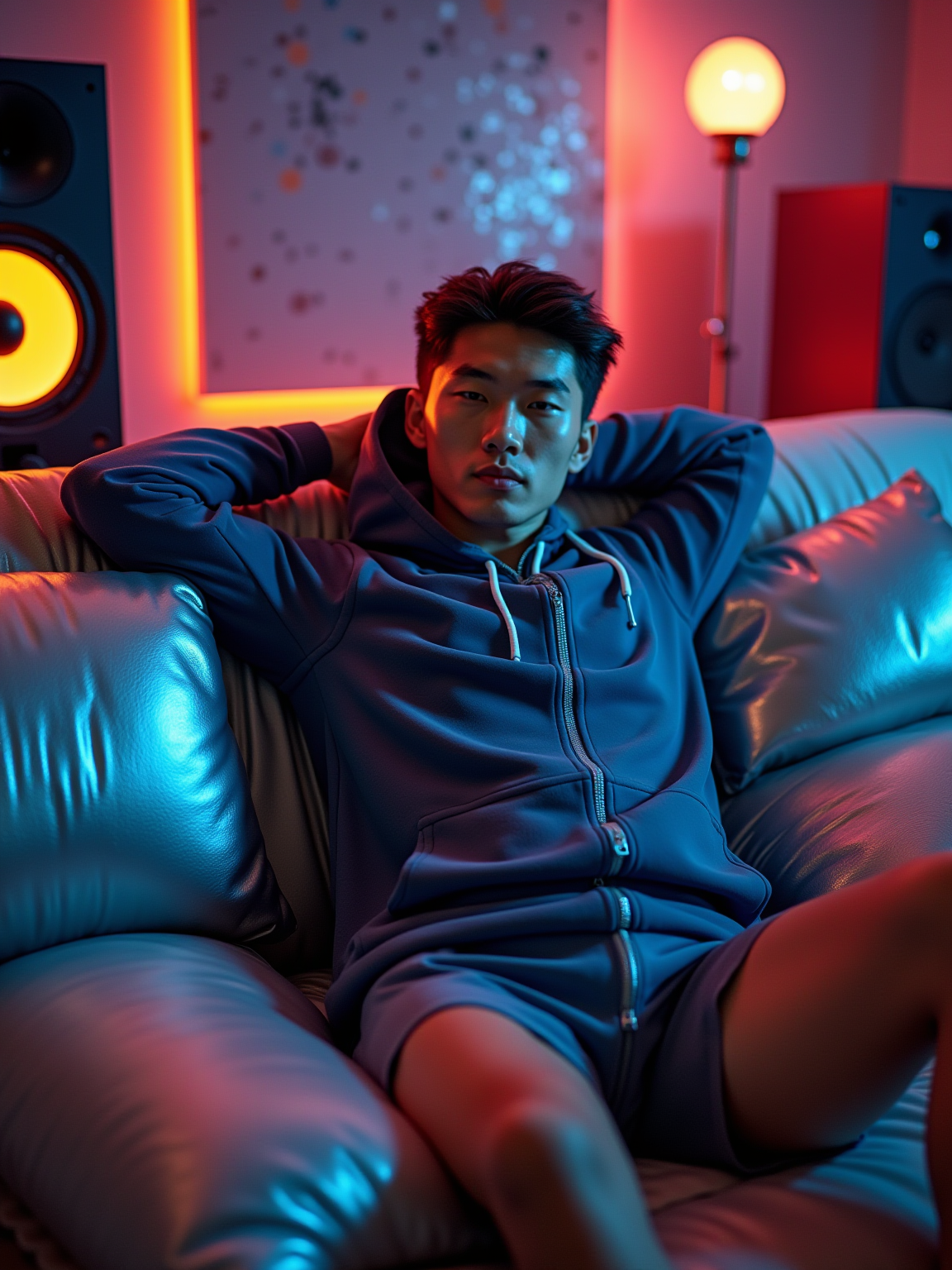 model lounging on a futon with metallic pillows, wearing a zip-up hoodie with athletic shorts, surrounded by tower speakers and a component stereo system, frosted glass and chrome decor on walls, plasma ball and fiber optic decorations creating ambient lighting