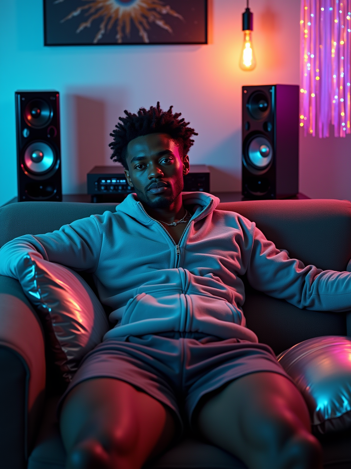 model lounging on a futon with metallic pillows, wearing a zip-up hoodie with athletic shorts, surrounded by tower speakers and a component stereo system, frosted glass and chrome decor on walls, plasma ball and fiber optic decorations creating ambient lighting