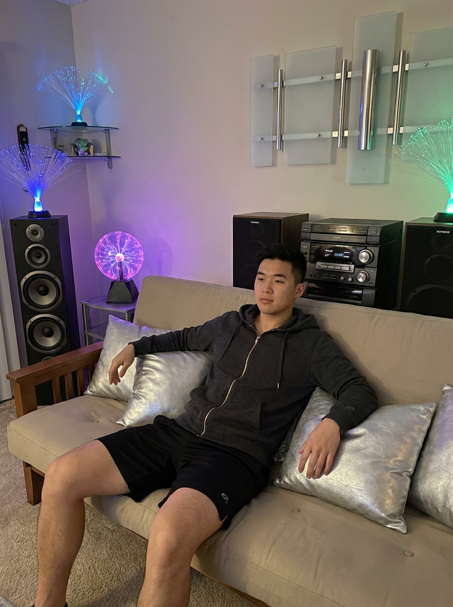 model lounging on a futon with metallic pillows, wearing a zip-up hoodie with athletic shorts, surrounded by tower speakers and a component stereo system, frosted glass and chrome decor on walls, plasma ball and fiber optic decorations creating ambient lighting
