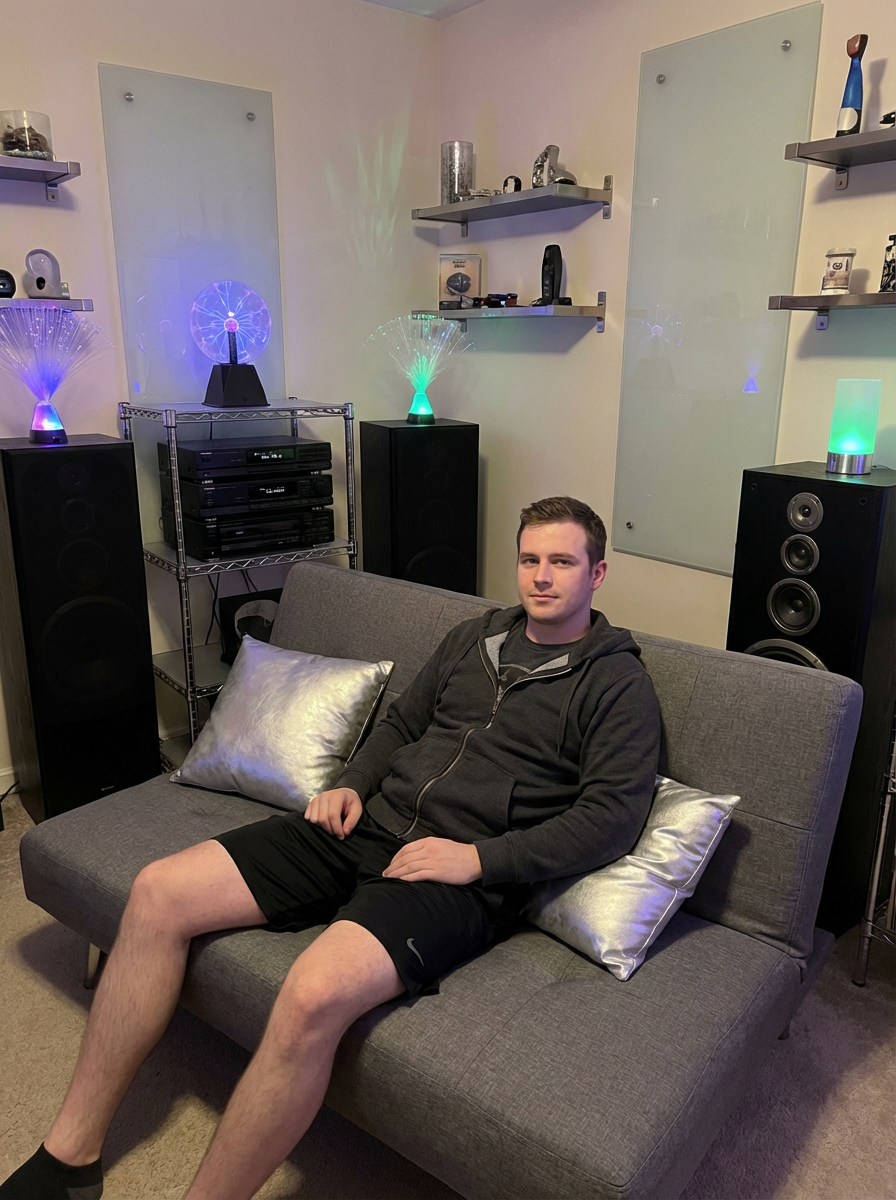 model lounging on a futon with metallic pillows, wearing a zip-up hoodie with athletic shorts, surrounded by tower speakers and a component stereo system, frosted glass and chrome decor on walls, plasma ball and fiber optic decorations creating ambient lighting