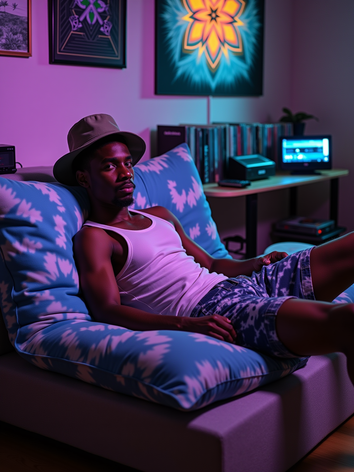 model lounging on a futon with tie-dye pillows, wearing a bucket hat, tank top, and board shorts, surrounded by Discman players and CD albums, geometric art on walls, blacklight poster glowing under purple lighting