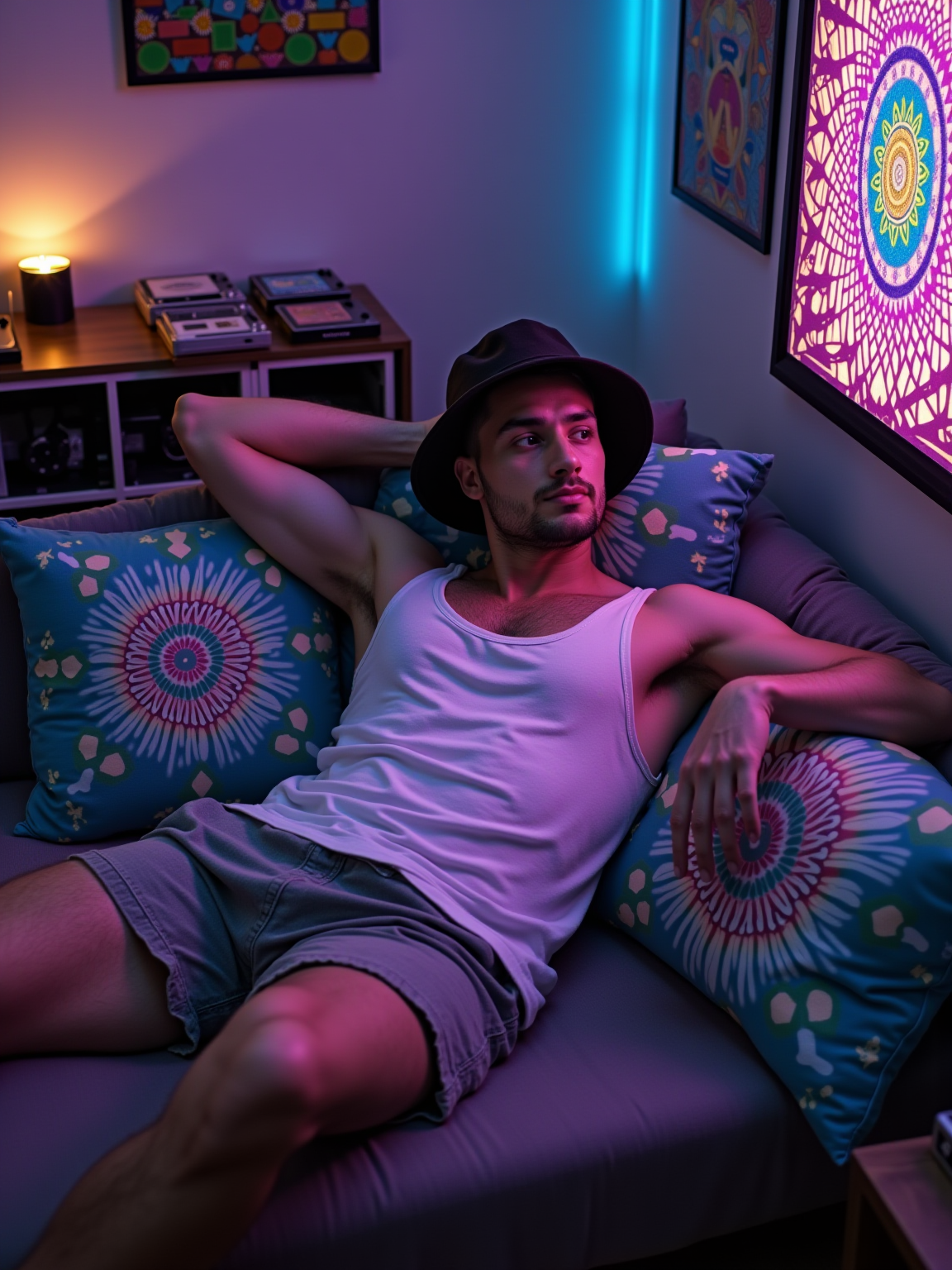 model lounging on a futon with tie-dye pillows, wearing a bucket hat, tank top, and board shorts, surrounded by Discman players and CD albums, geometric art on walls, blacklight poster glowing under purple lighting
