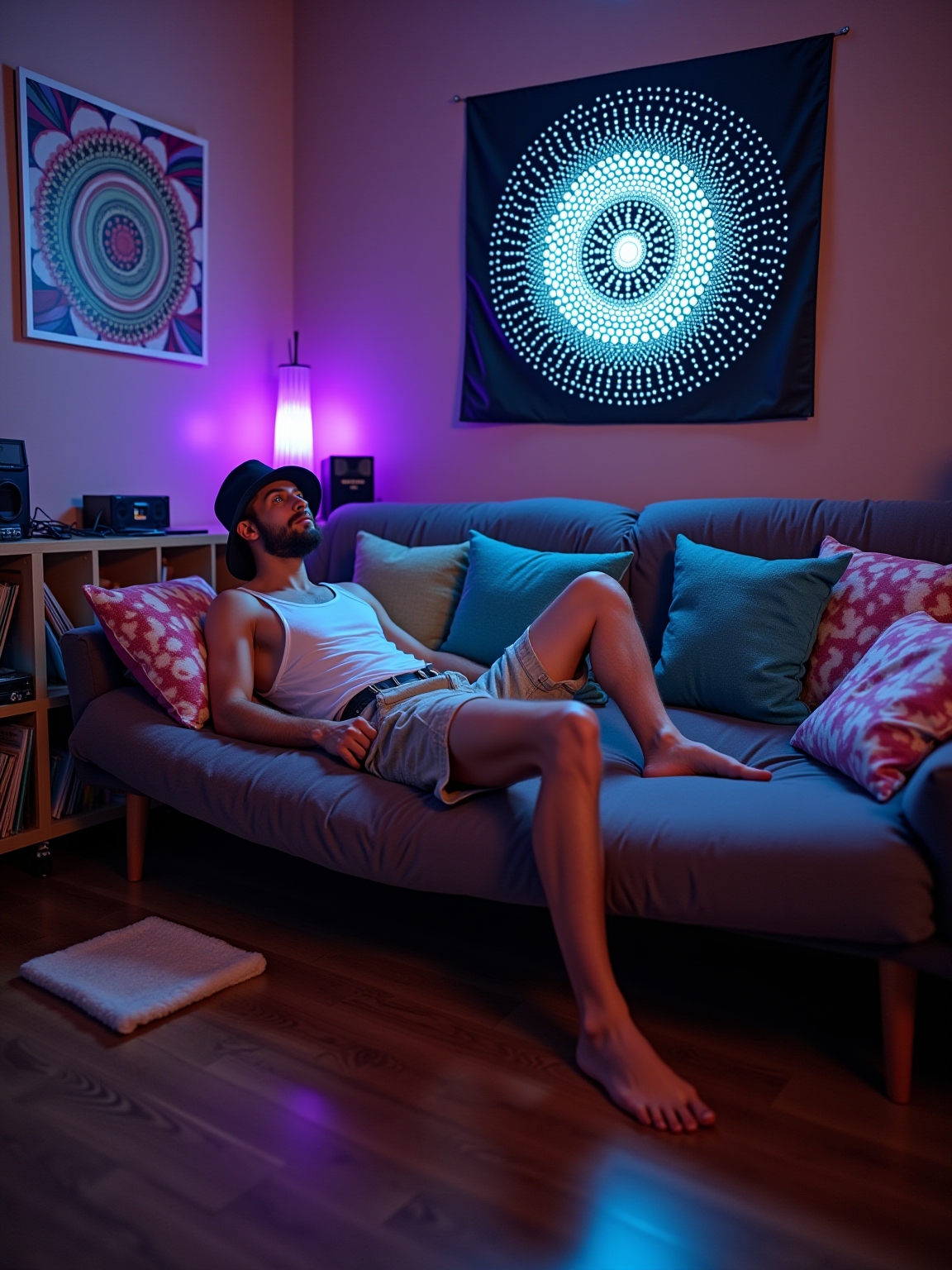 model lounging on a futon with tie-dye pillows, wearing a bucket hat, tank top, and board shorts, surrounded by Discman players and CD albums, geometric art on walls, blacklight poster glowing under purple lighting