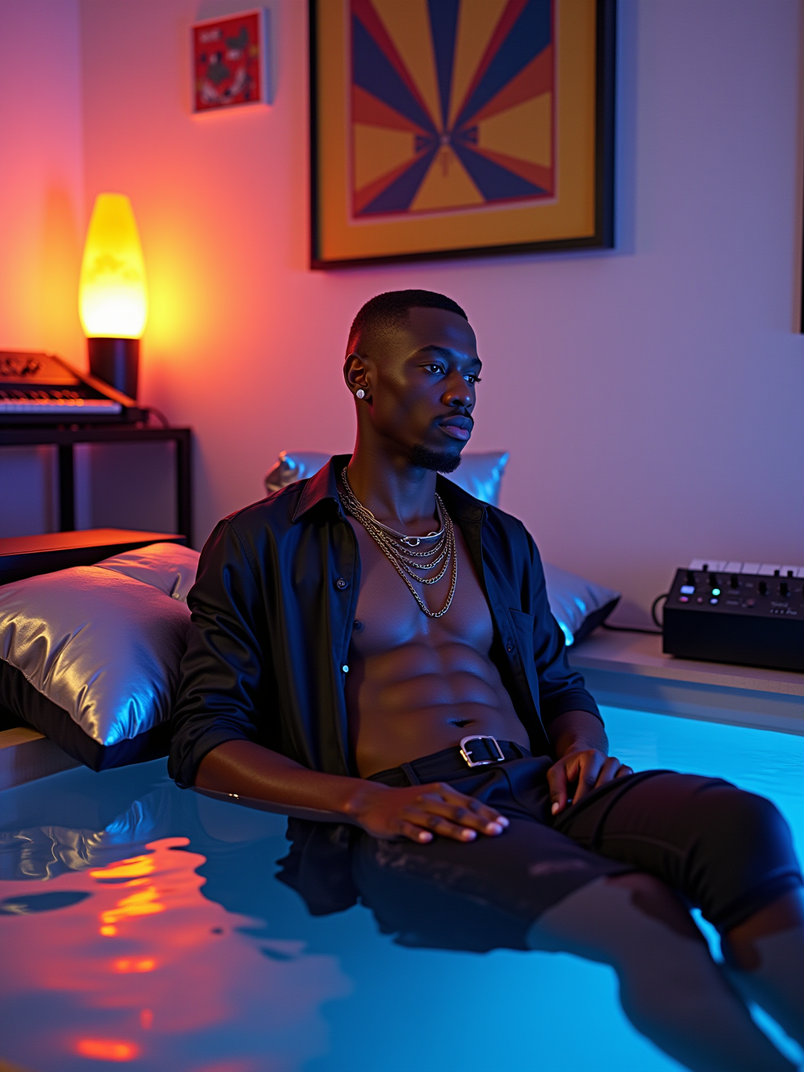 model lounging on a waterbed with metallic pillows, wearing silk shirt unbuttoned with gold chains, surrounded by electronic keyboards and drum machines, geometric abstract art on walls, lava lamp and fiber optic lamp creating ambient lighting