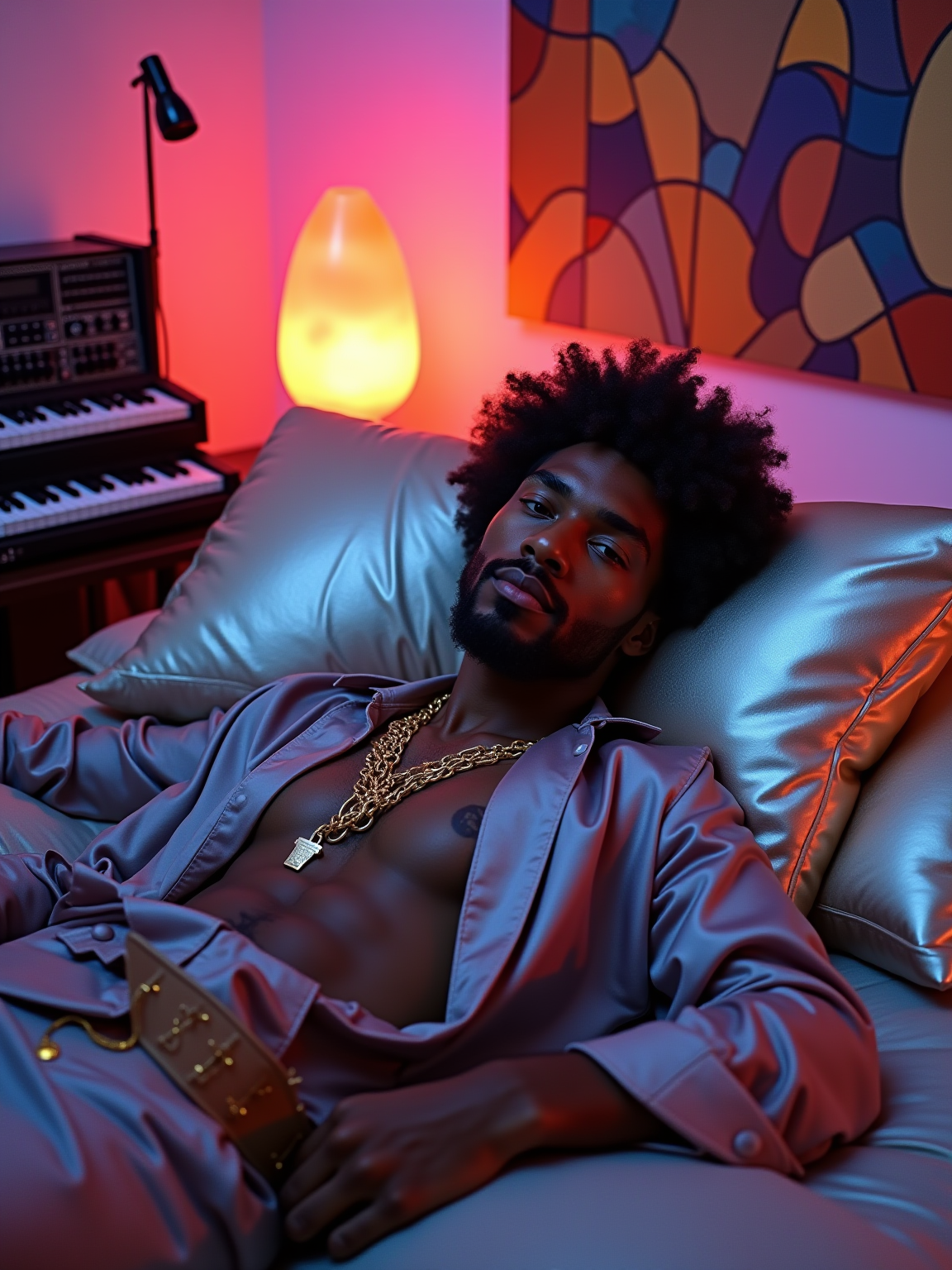 model lounging on a waterbed with metallic pillows, wearing silk shirt unbuttoned with gold chains, surrounded by electronic keyboards and drum machines, geometric abstract art on walls, lava lamp and fiber optic lamp creating ambient lighting