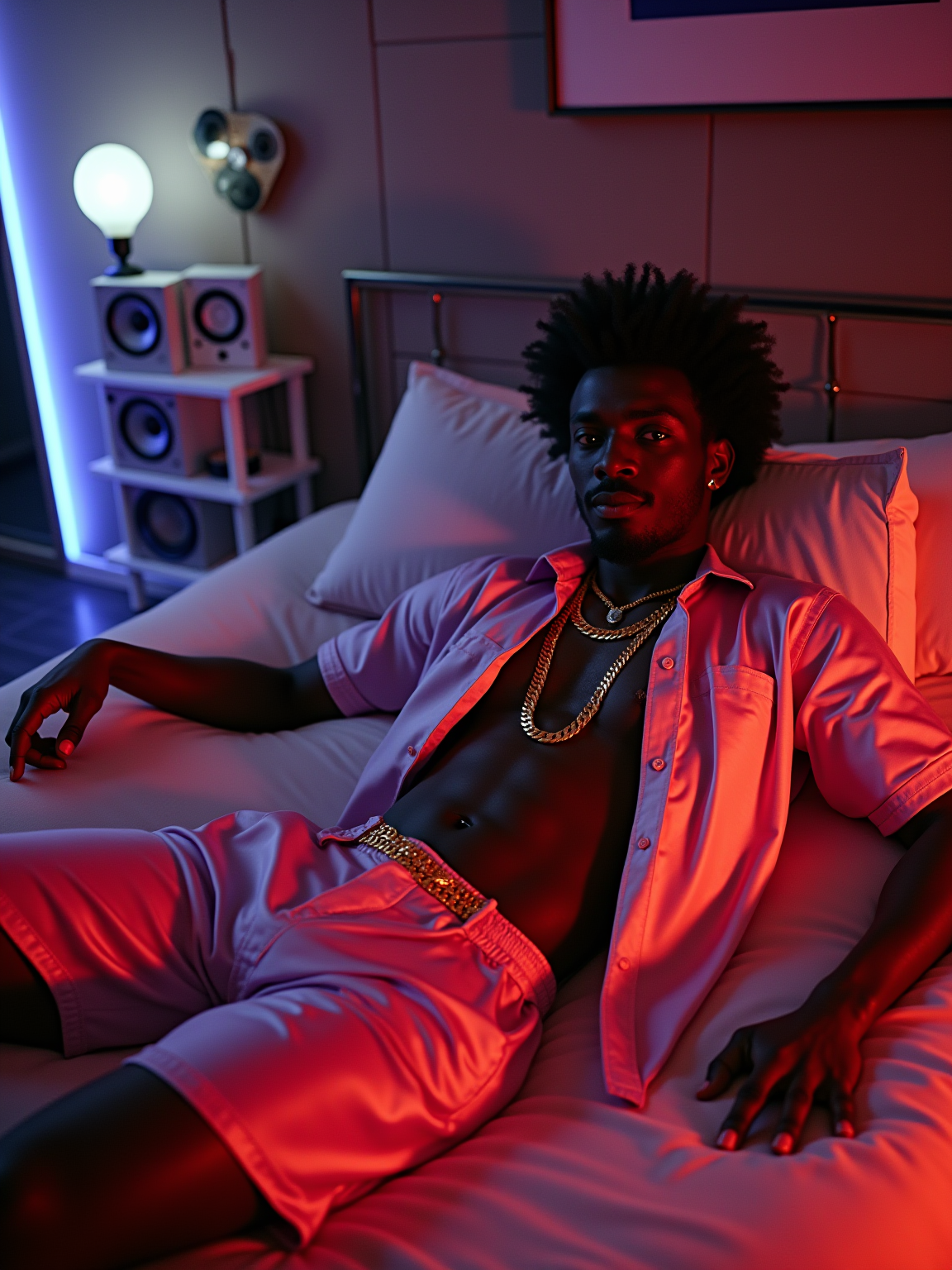 model lounging on a waterbed with velvet pillows, wearing silk shirt open at the chest with gold chains, surrounded by quadraphonic speakers and a reel-to-reel tape deck, abstract art and mirror tiles on walls, fiber optic lamp and black light creating ambient mood lighting