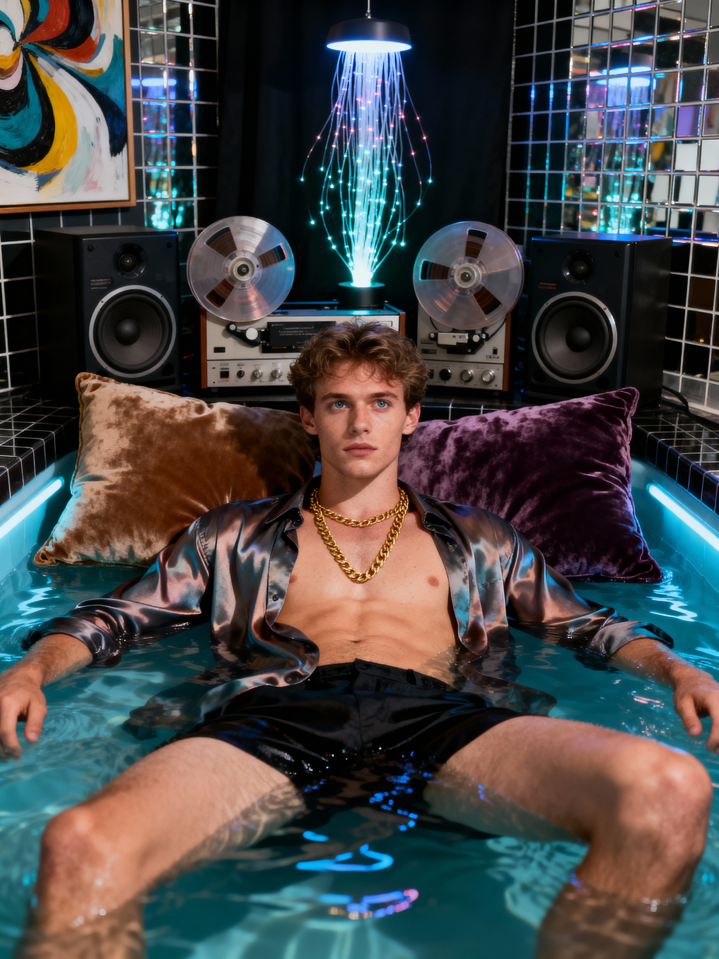 model lounging on a waterbed with velvet pillows, wearing silk shirt open at the chest with gold chains, surrounded by quadraphonic speakers and a reel-to-reel tape deck, abstract art and mirror tiles on walls, fiber optic lamp and black light creating ambient mood lighting