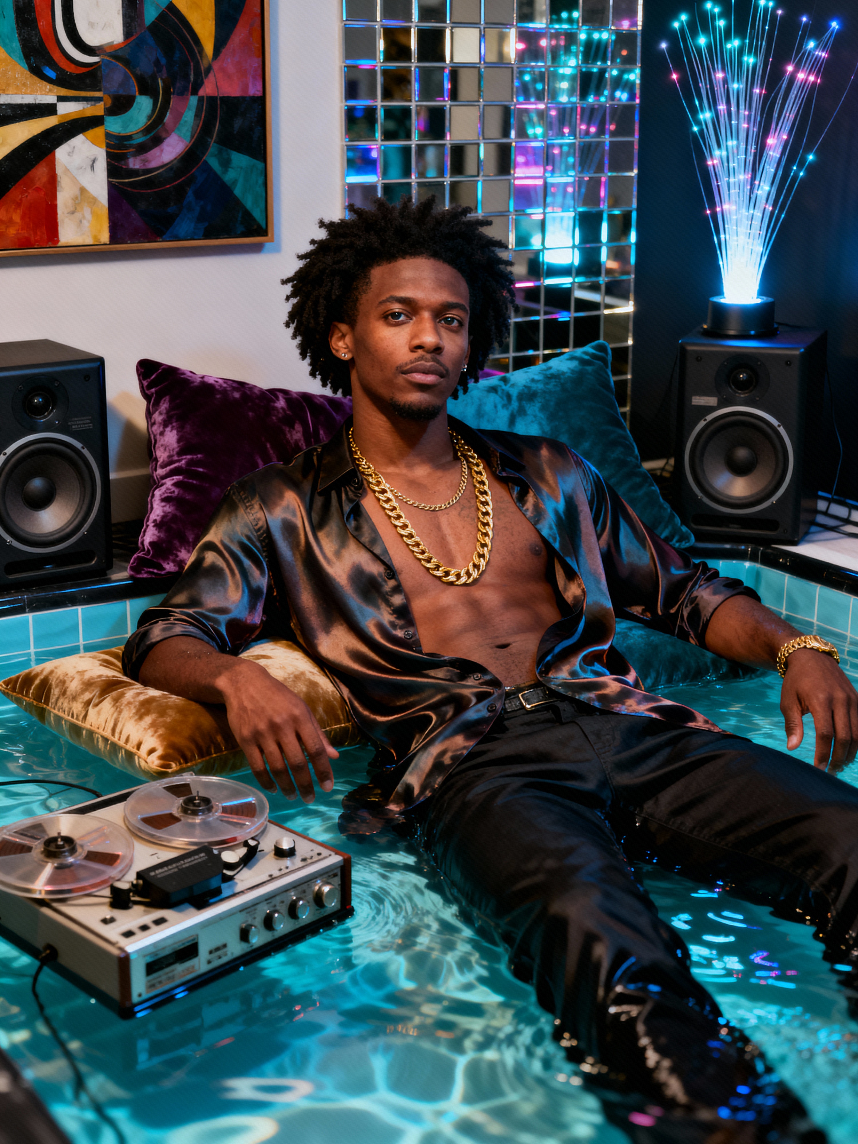model lounging on a waterbed with velvet pillows, wearing silk shirt open at the chest with gold chains, surrounded by quadraphonic speakers and a reel-to-reel tape deck, abstract art and mirror tiles on walls, fiber optic lamp and black light creating ambient mood lighting