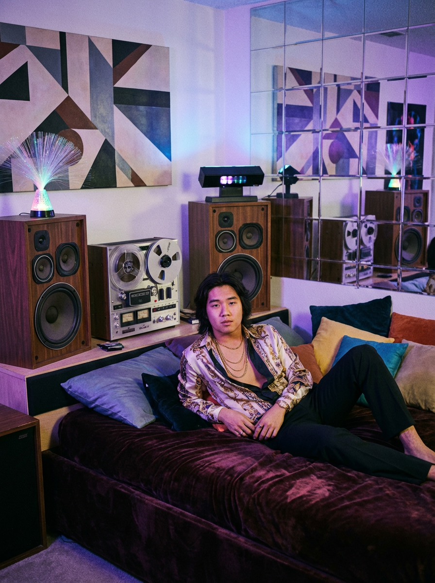 model lounging on a waterbed with velvet pillows, wearing silk shirt open at the chest with gold chains, surrounded by quadraphonic speakers and a reel-to-reel tape deck, abstract art and mirror tiles on walls, fiber optic lamp and black light creating ambient mood lighting
