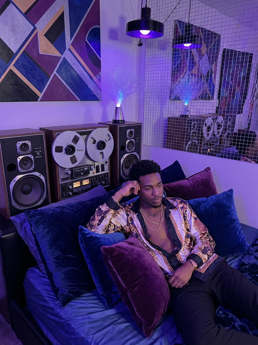 model lounging on a waterbed with velvet pillows, wearing silk shirt open at the chest with gold chains, surrounded by quadraphonic speakers and a reel-to-reel tape deck, abstract art and mirror tiles on walls, fiber optic lamp and black light creating ambient mood lighting