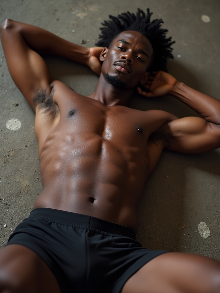 model lying on the ground in seductive pose wearing black boxer shorts the photo emphasizes their exaggerated, idealized body shapes.