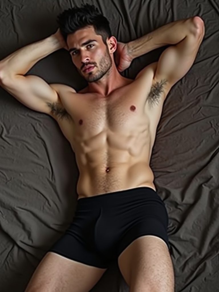 model lying on the ground in seductive pose wearing black boxer shorts the photo emphasizes their exaggerated, idealized body shapes.