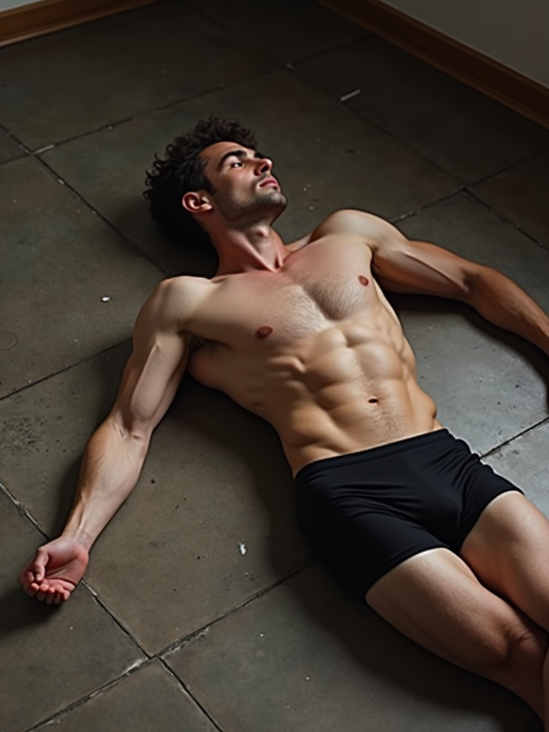 model lying on the ground in seductive pose wearing black boxer shorts the photo emphasizes their exaggerated, idealized body shapes.