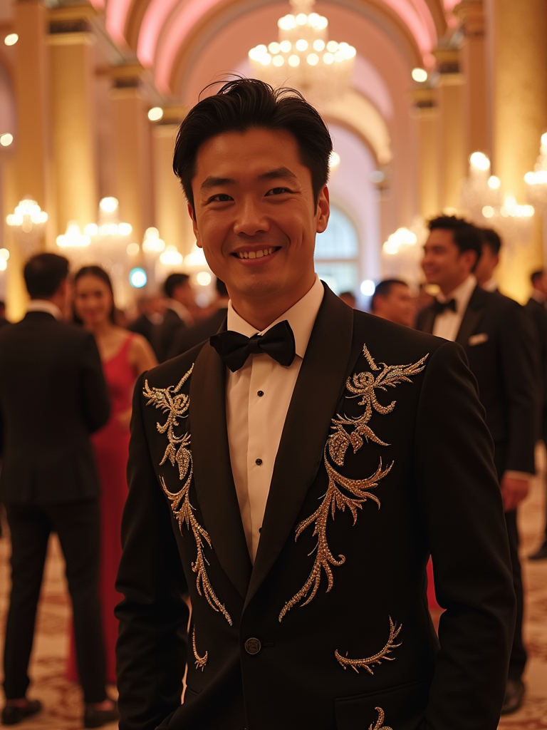 model mingling with A-list celebrities inside the Met Gala main hall, wearing a sophisticated suit with artistic embellishments, lavish Met Gala decorations and themed installations visible