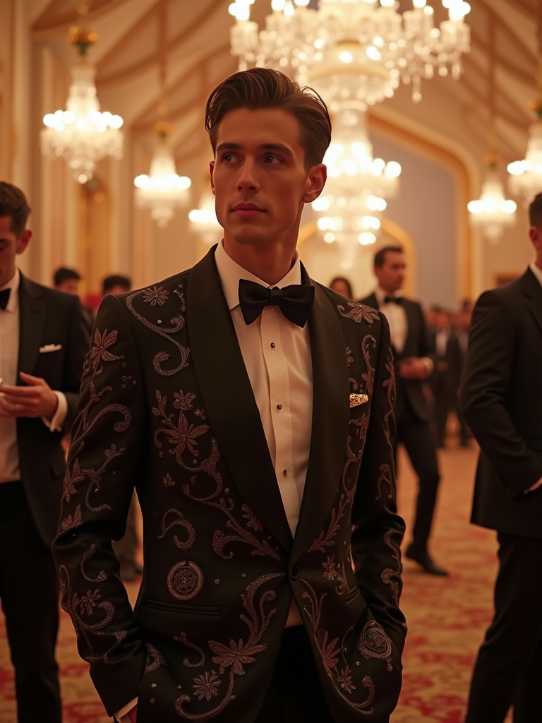 model mingling with A-list celebrities inside the Met Gala main hall, wearing a sophisticated suit with artistic embellishments, lavish Met Gala decorations and themed installations visible