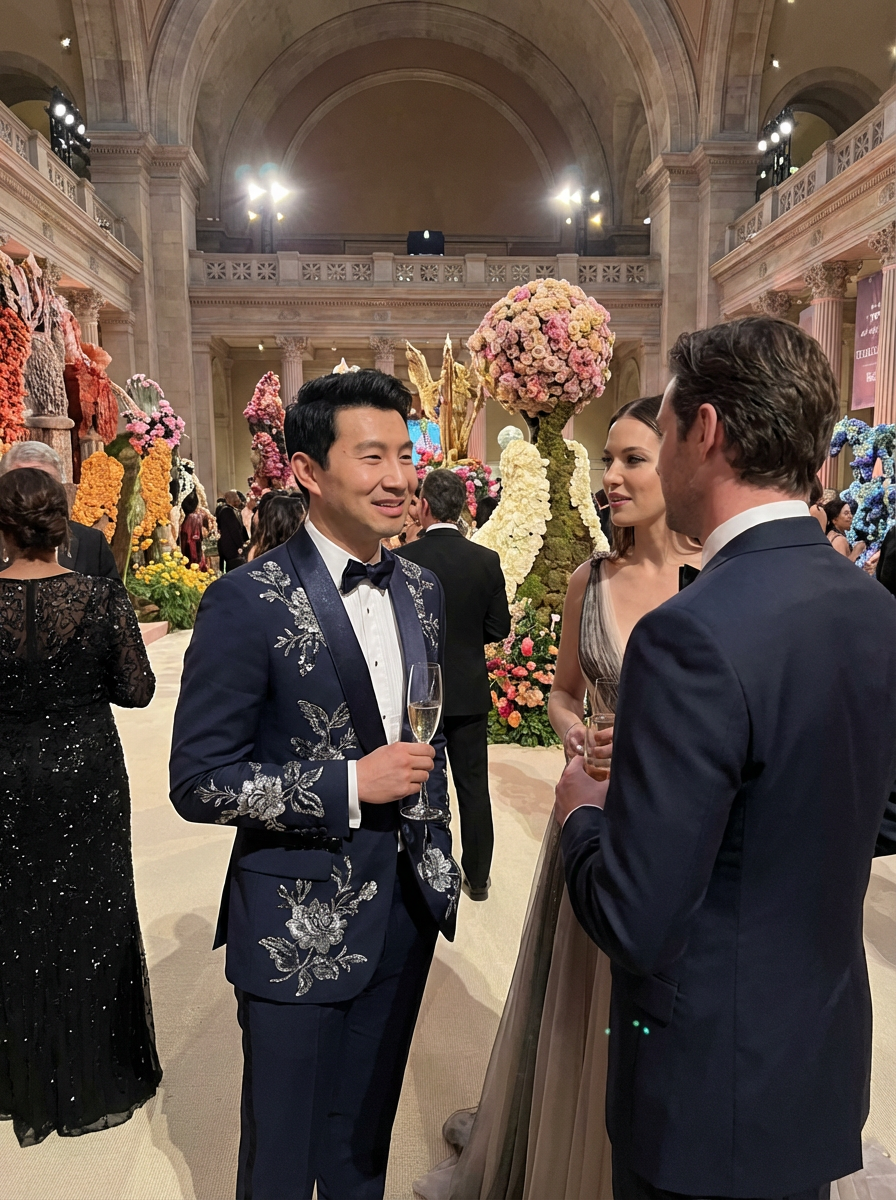 model mingling with A-list celebrities inside the Met Gala main hall, wearing a sophisticated suit with artistic embellishments, lavish Met Gala decorations and themed installations visible