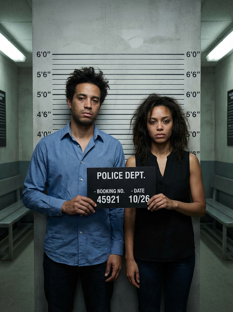 model mugshot with disheveled hair, tired expression, height measurement lines on wall behind, police station aesthetic