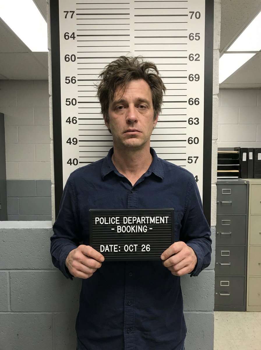 model mugshot with disheveled hair, tired expression, height measurement lines on wall behind, police station aesthetic